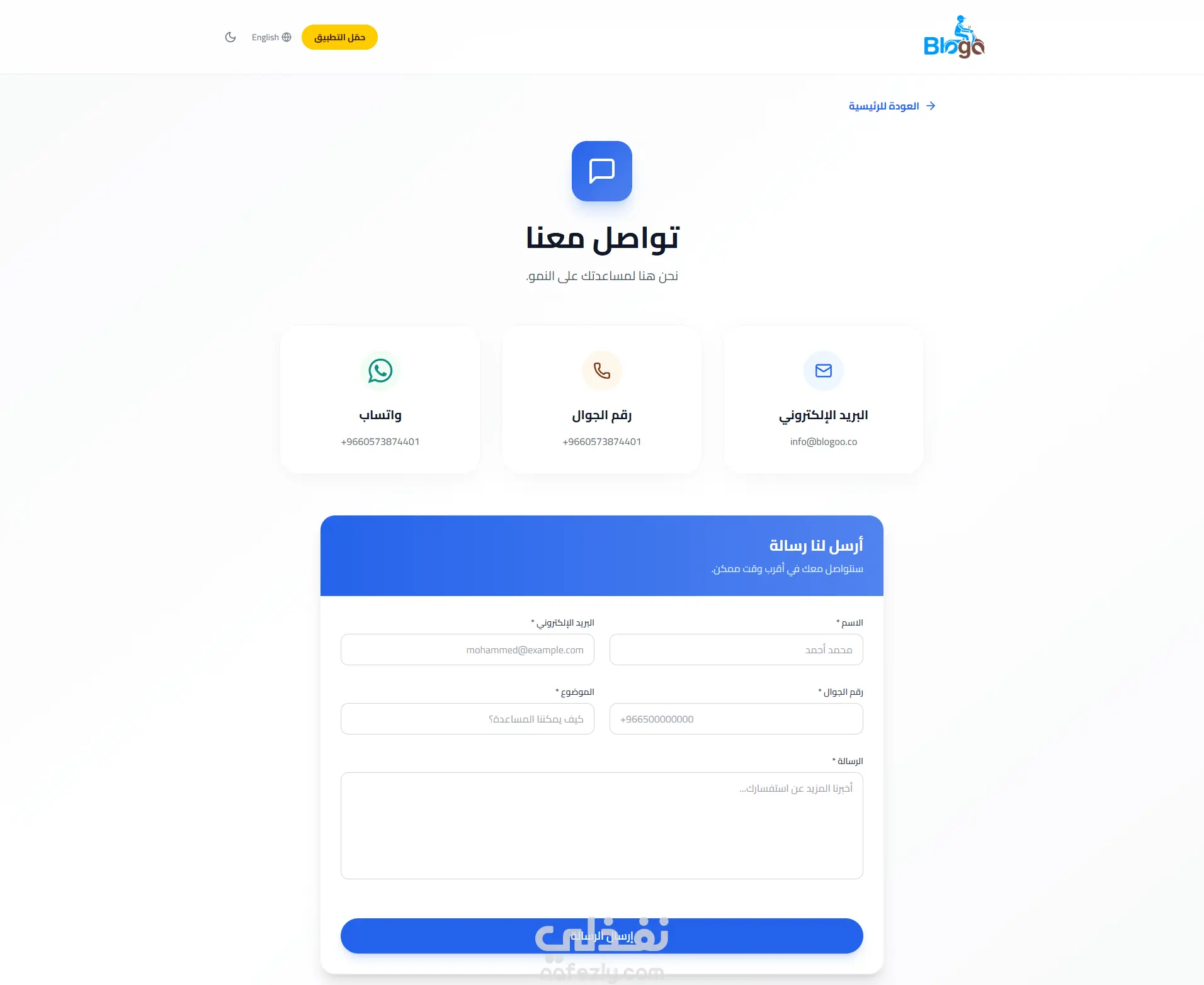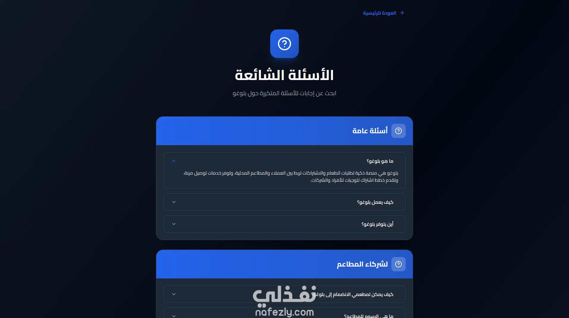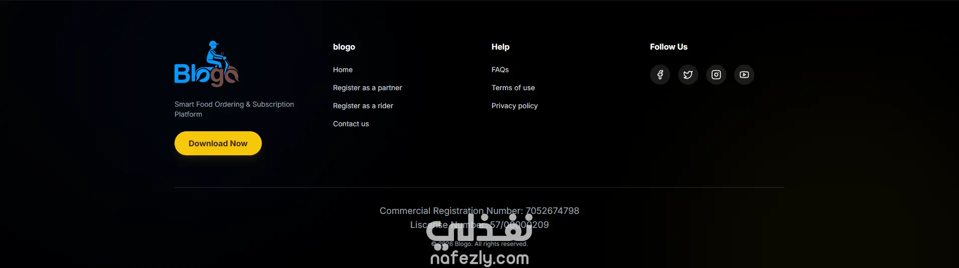 صفحة هبوط احترافية وتقديم لشركة Blogo (بلوغو)، وهي منصة اشتراكات ذكية تستهدف المطاعم لزيادة الظهور، رفع الطلبات، وبناء قاعدة عملاء وفية من خلال حملات توصيل مجاني وأنظمة ولاء متقدمة.