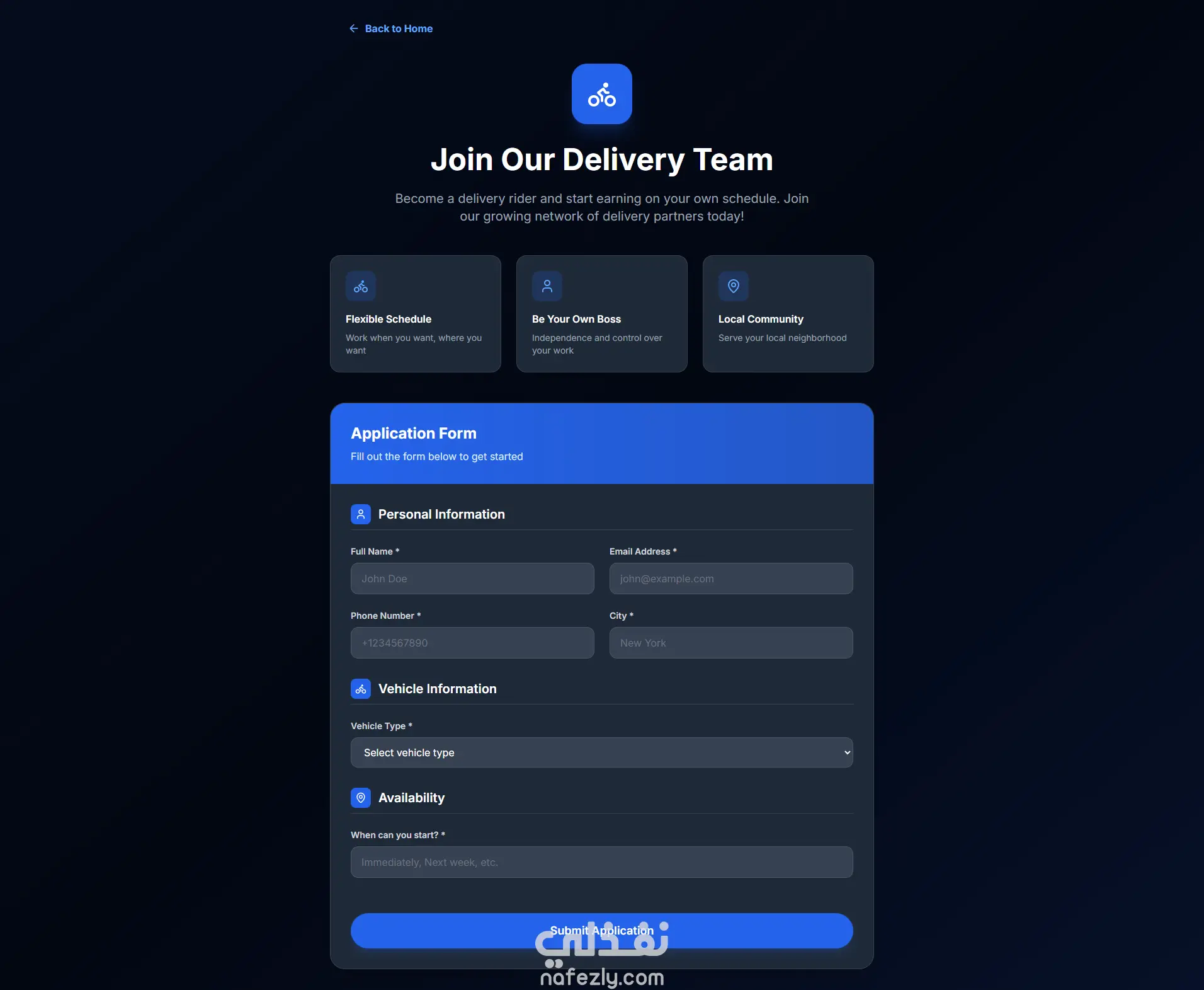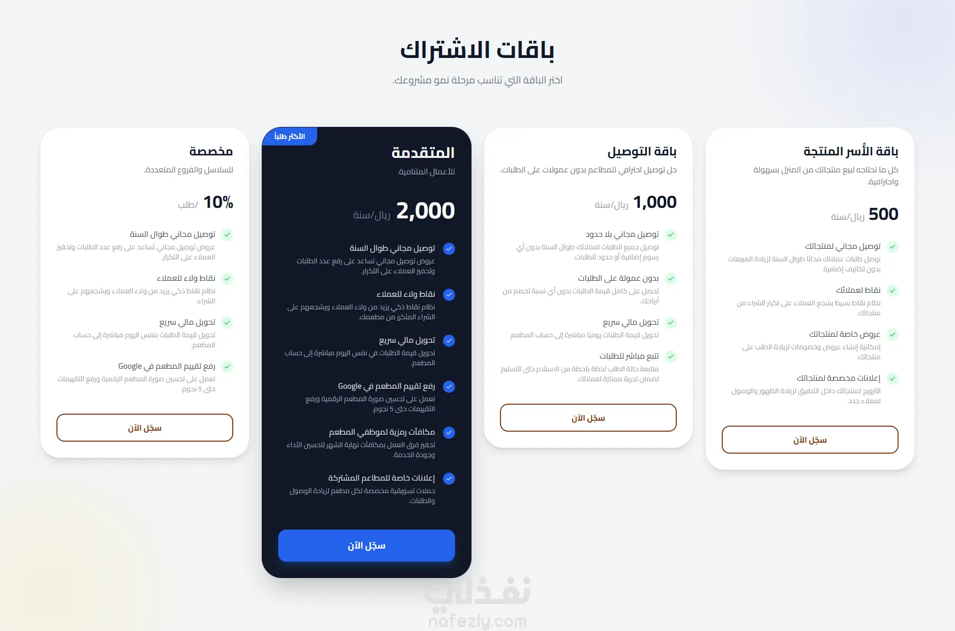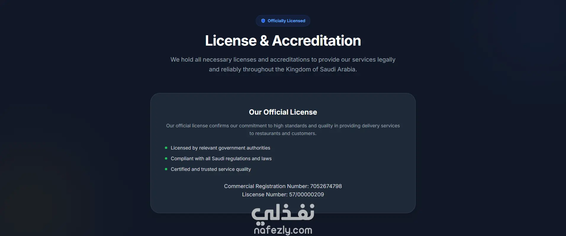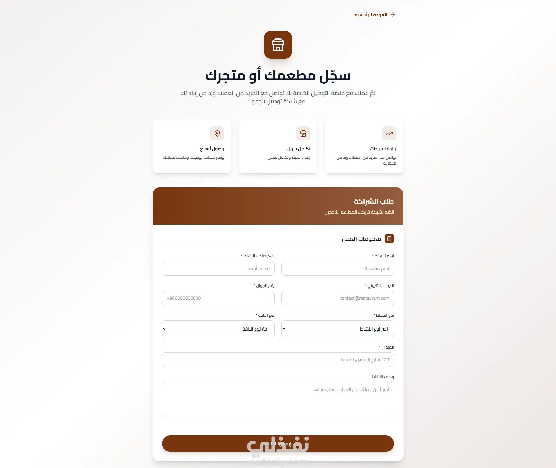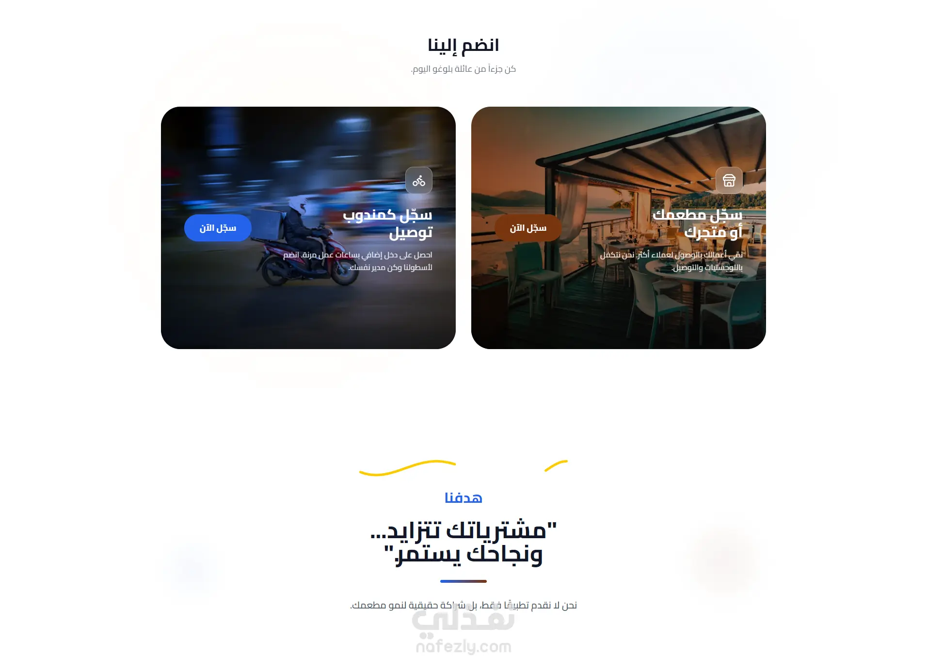 تقدّم الصفحة تجربة تفاعلية موحّدة بأسلوب scrolling سلس، تجمع بين التعريف بالشركة والترويج للتطبيق، مع إمكانية تسجيل المطاعم ومندوبي التوصيل بسهولة عبر نماذج مرتبطة بـ Google Sheets.