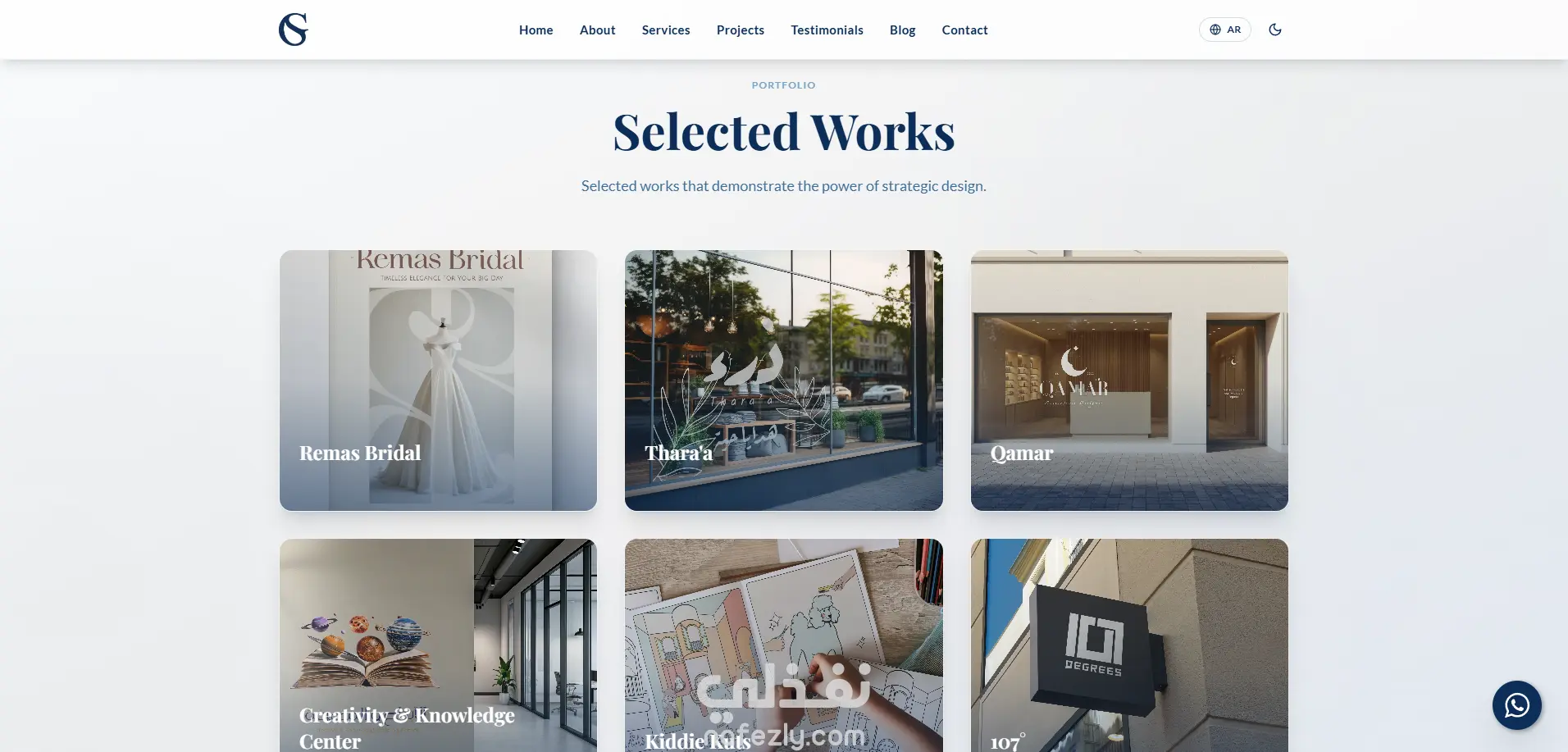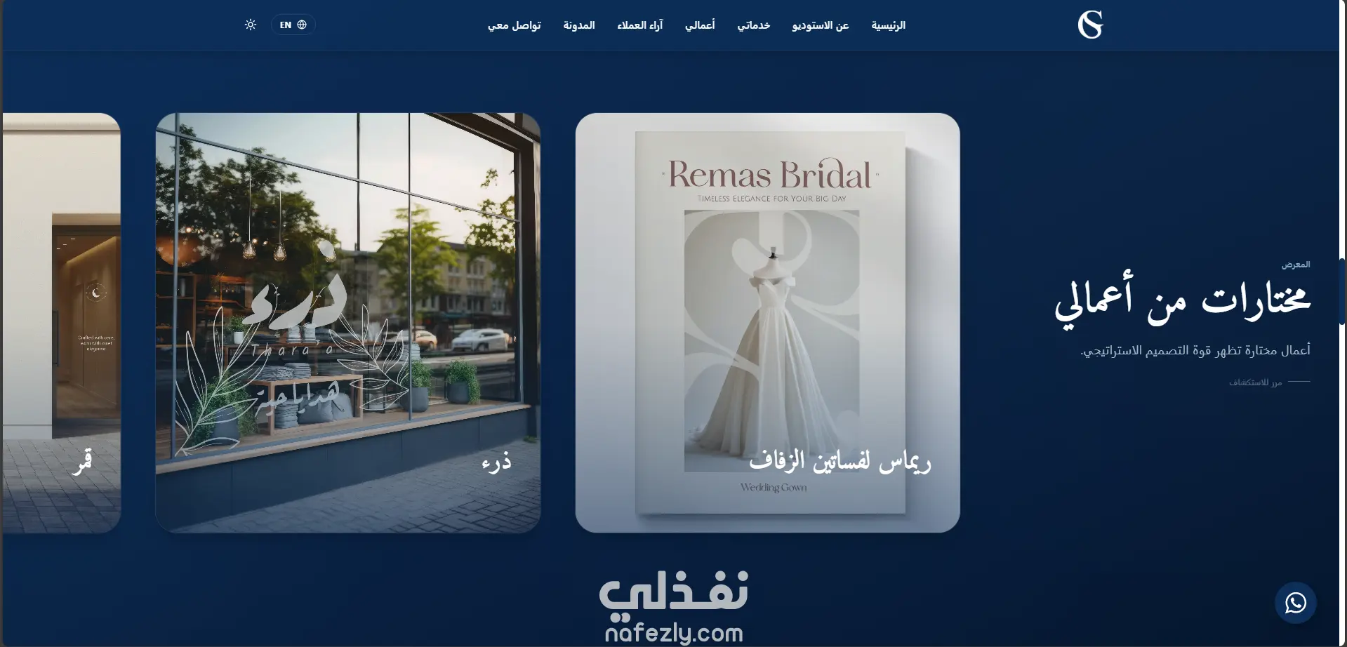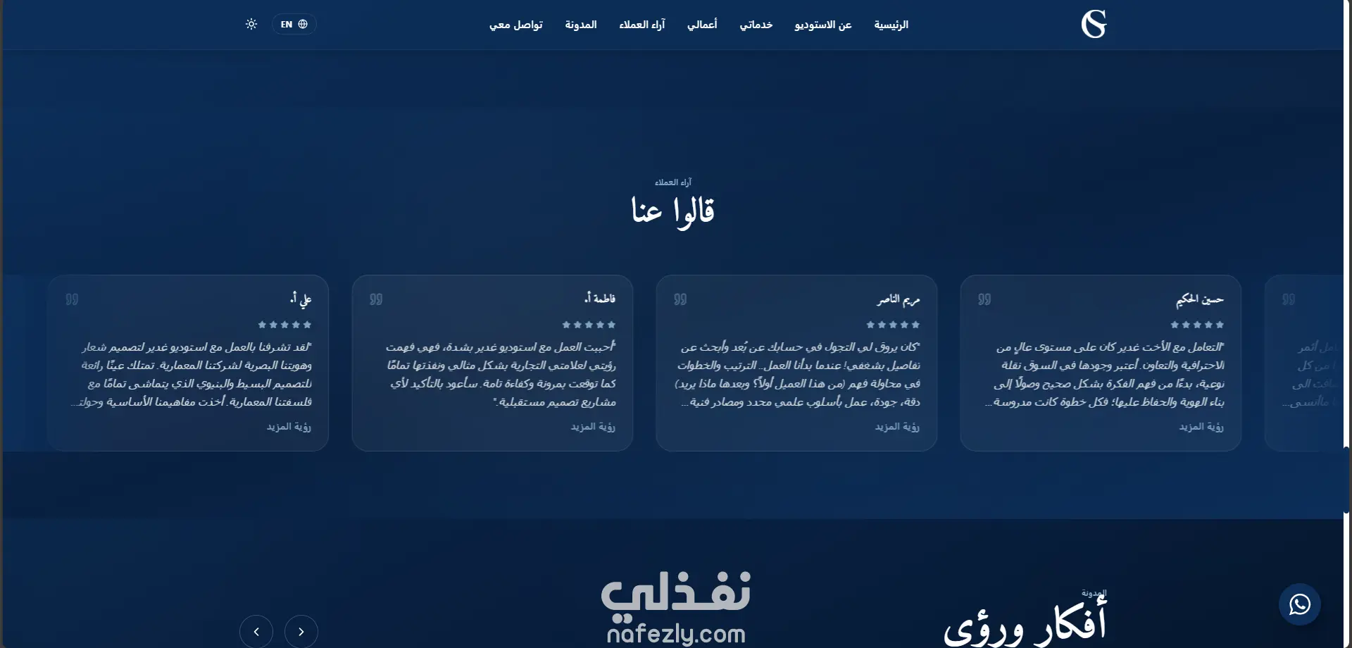 يوفّر تجربة سلسة بثنائي اللغة (عربي/إنجليزي)، مع دعم Light/Dark Mode، وصفحات تفصيلية لكل مشروع ومقال، بالإضافة إلى زر واتساب عائم لتسهيل التواصل.