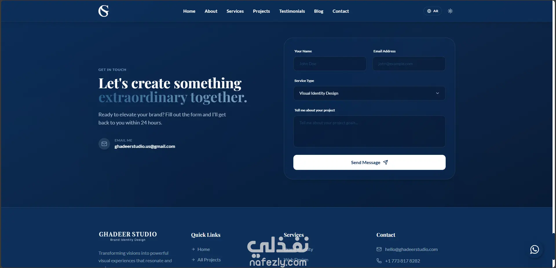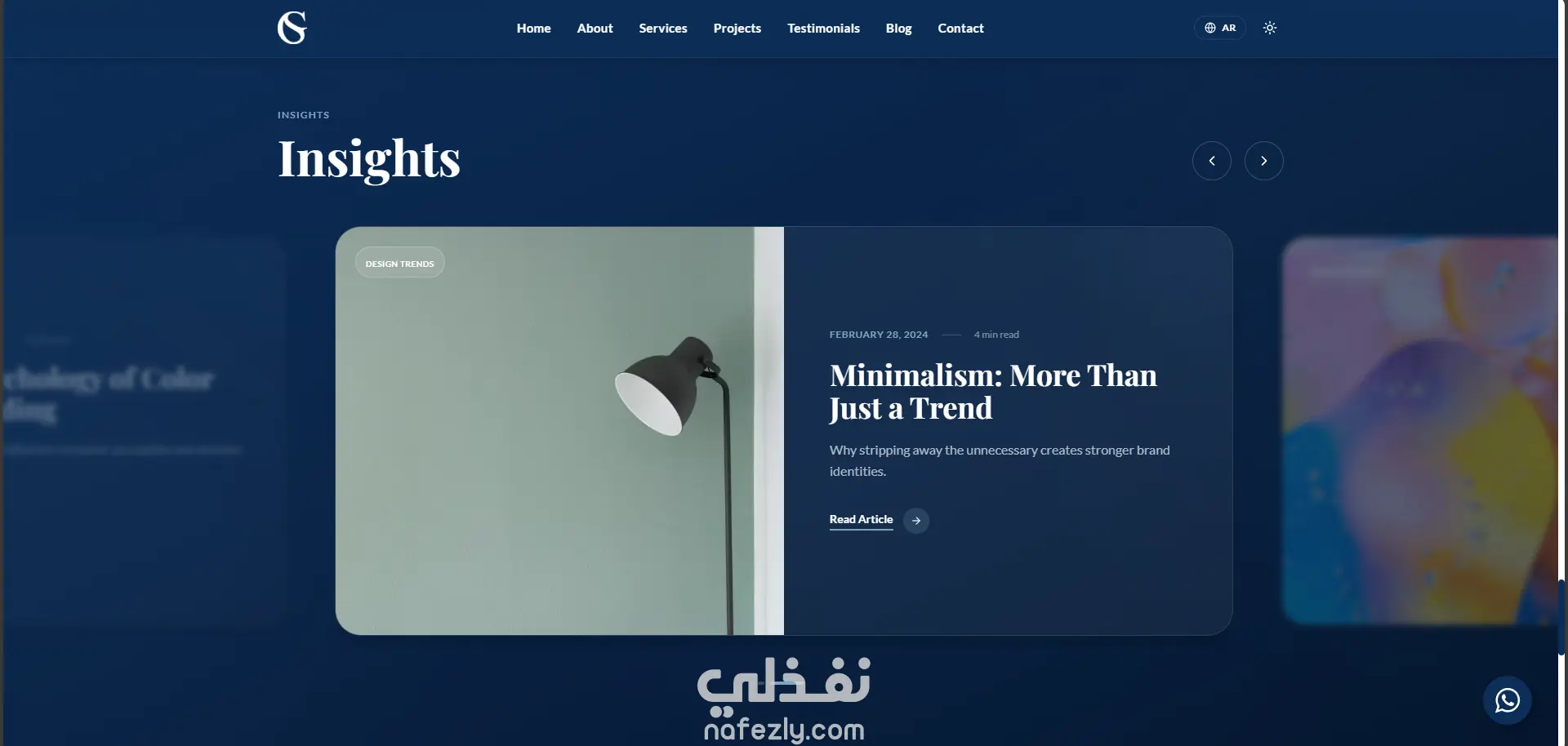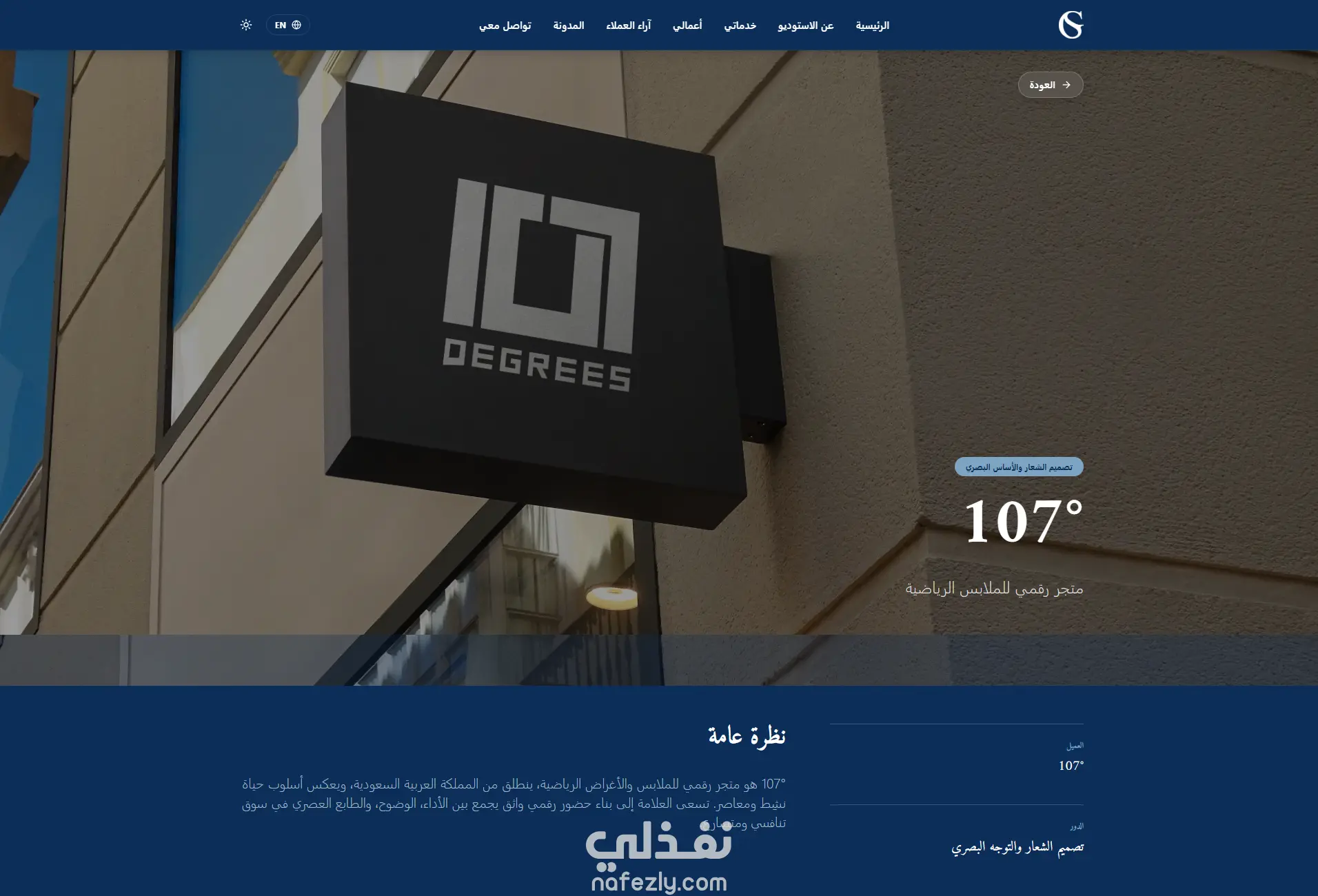 يوفّر تجربة سلسة بثنائي اللغة (عربي/إنجليزي)، مع دعم Light/Dark Mode، وصفحات تفصيلية لكل مشروع ومقال، بالإضافة إلى زر واتساب عائم لتسهيل التواصل.