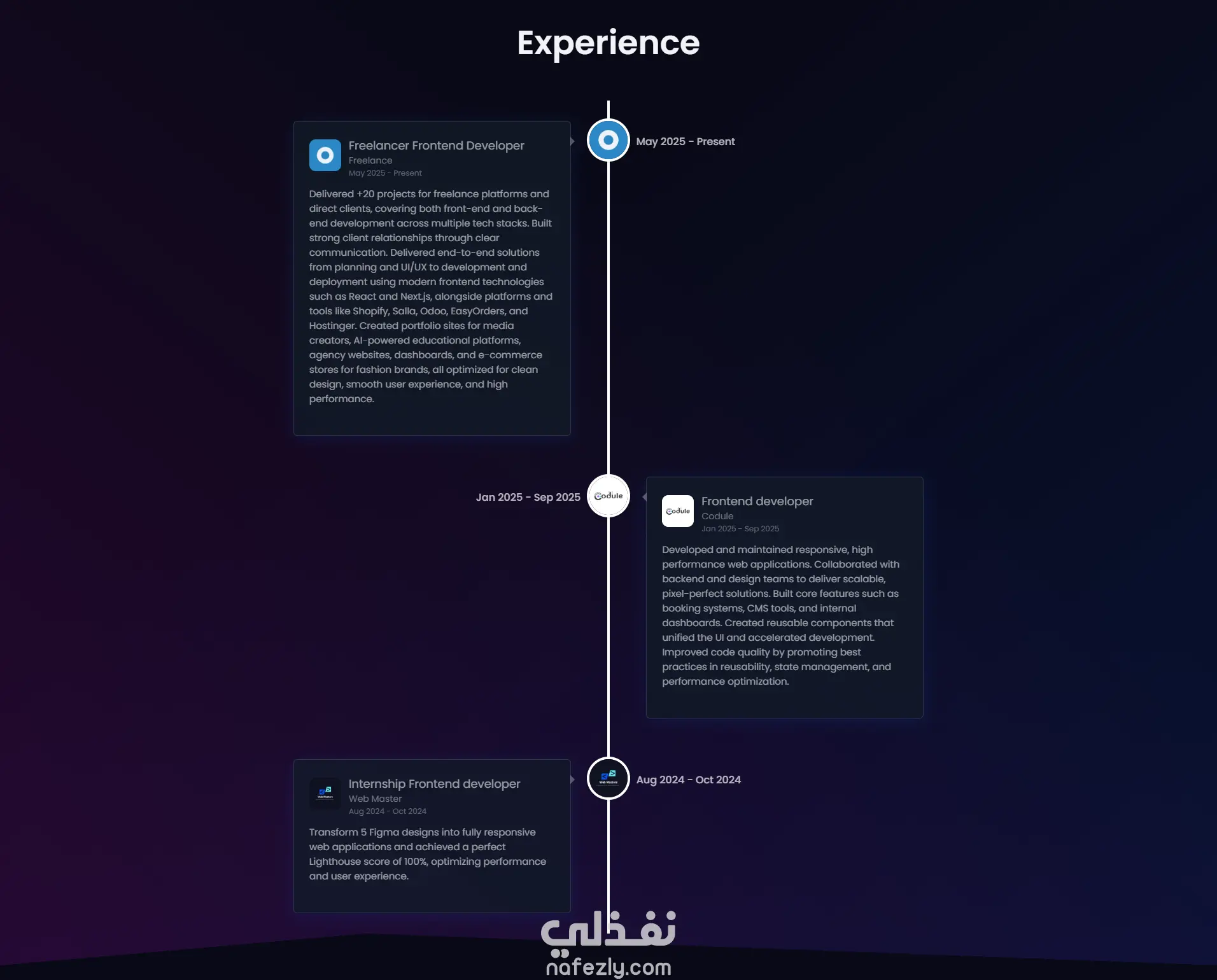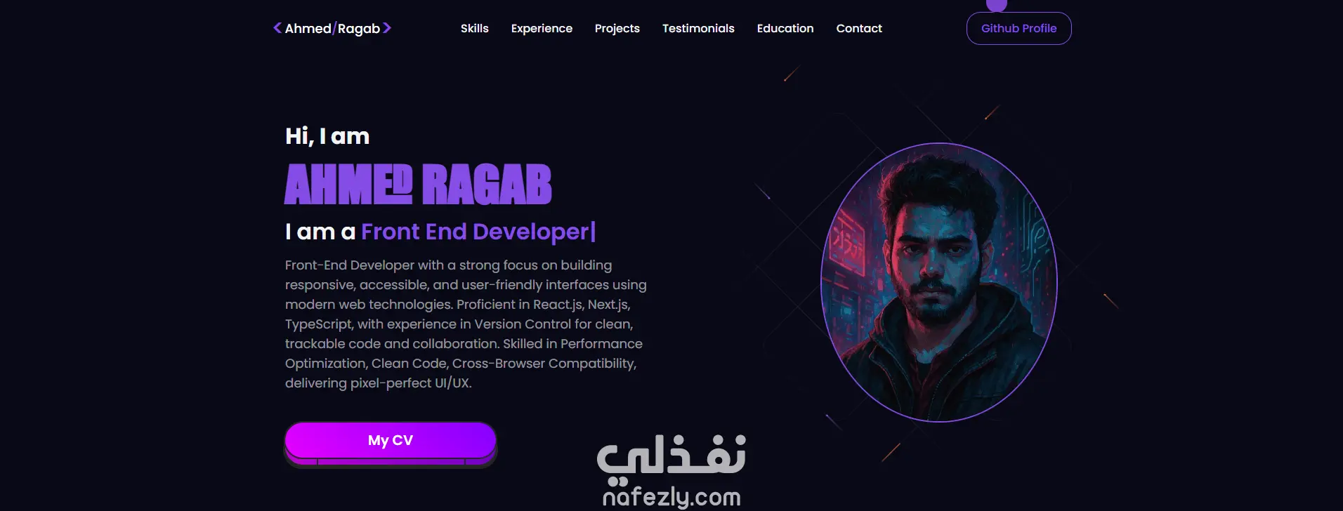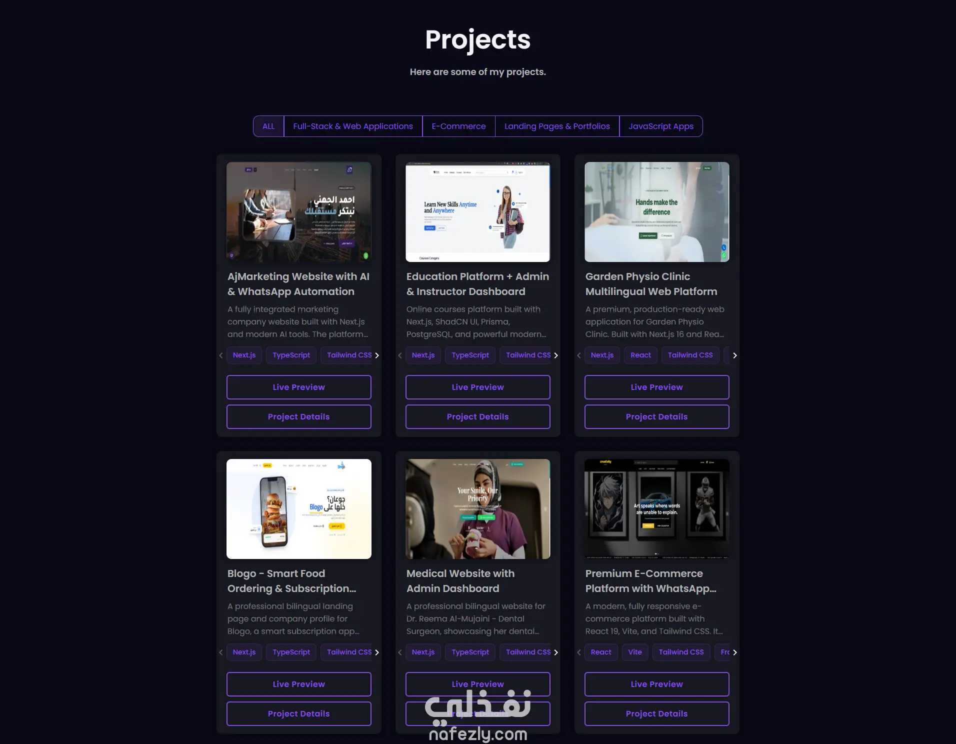 موقع بورتفوليو شخصي حديث مصمم لعرض المشاريع، المهارات، والخبرات بأسلوب تفاعلي يجمع بين الأداء العالي والتجربة البصرية الجذابة.