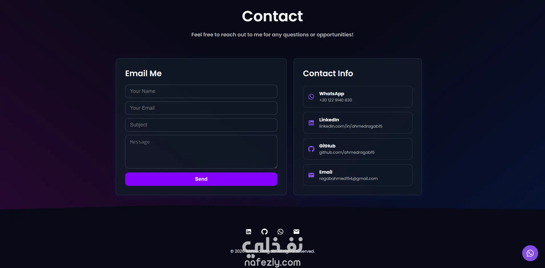 الموقع سريع، متجاوب بالكامل، وقابل للتخصيص، مع نموذج تواصل مباشر عبر EmailJS وزر واتساب لتسهيل التواصل.