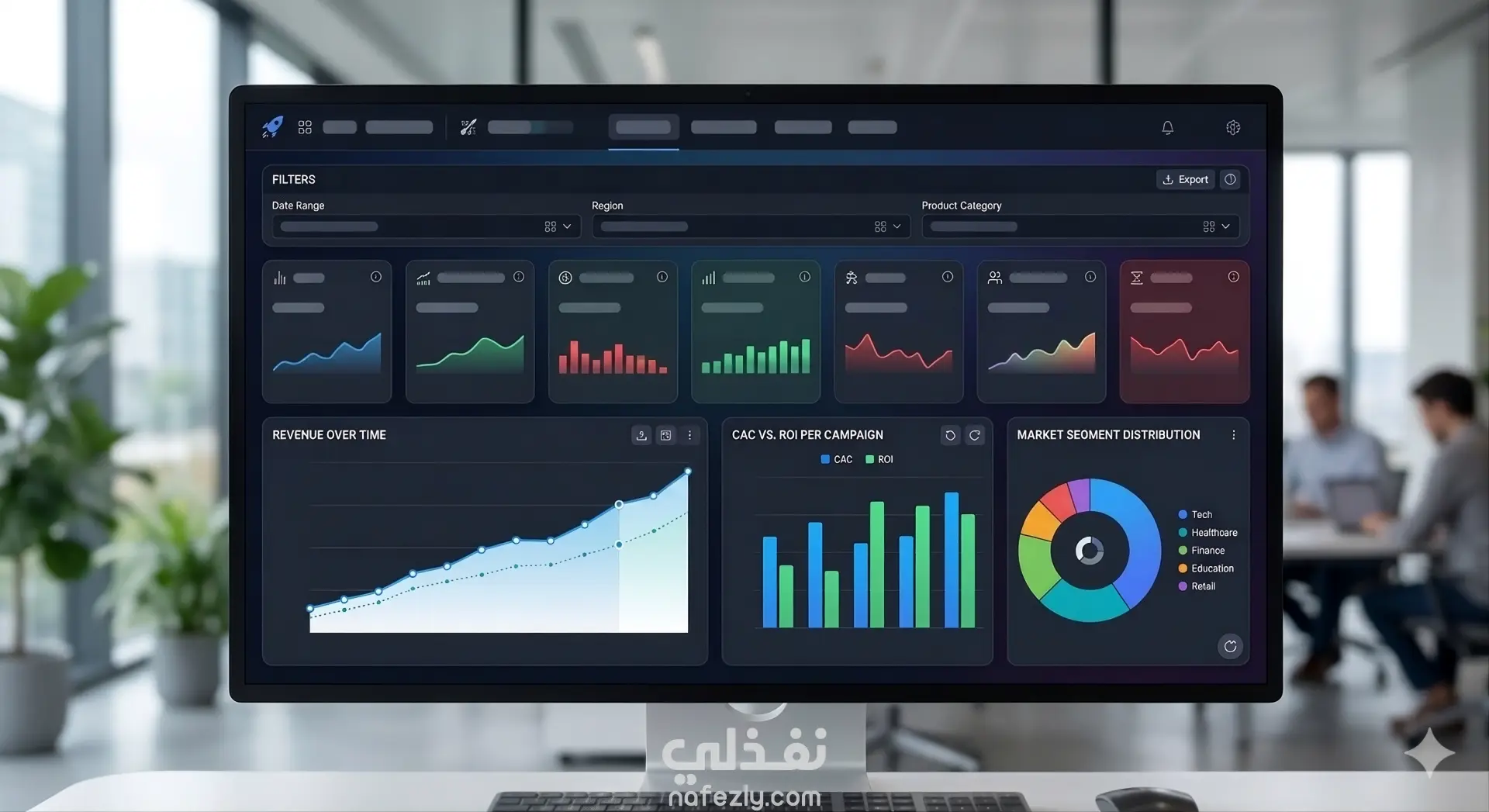 - تصميم Dashboard تفاعلية تحتوي على 5–10 مؤشرات رئيسية (KPIs) ورسوم بيانية توضح النمو والإيرادات والتوسع في الأسواق.