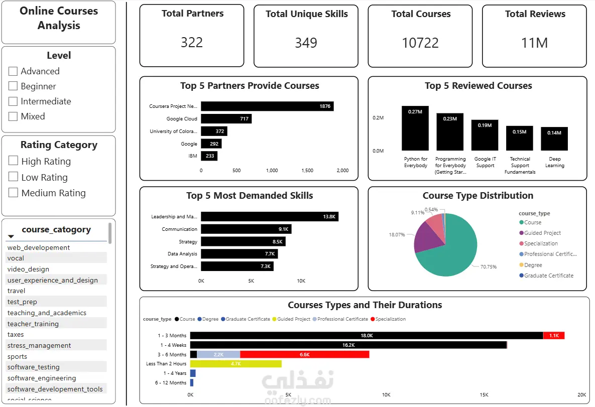 يقدم هذا المشروع تحليلاً شاملاً لبيانات الدورات التدريبية عبر الإنترنت، بهدف استخراج رؤى استراتيجية حول محركات السوق التعليمي الرقمي. تم تصميم لوحة البيانات (Dashboard) لتمكين صناع القرار من فهم توزيع المحتوى التعليمي، مهارات المستقبل الأكثر طلباً، وأداء الشركاء ومقدمي الخدمة بناءً على تفاعل المستخدمين.