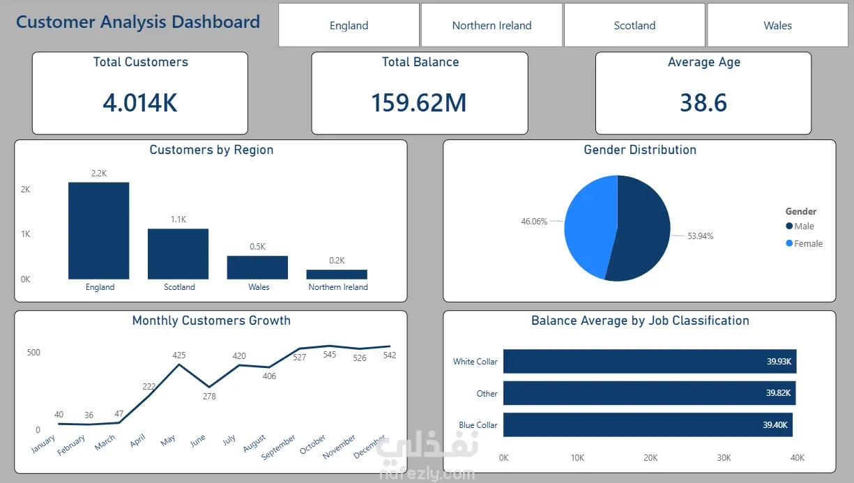 يهدف المشروع إلى تحليل قاعدة بيانات عملاء بنك أو مؤسسة مالية، وتوفير رؤية شاملة حول التوزيع الديموغرافي والمالي للعملاء. تم تصميم اللوحة لتمكين الإدارة من فهم خصائص العملاء (مثل الوظيفة، العمر، الموقع الجغرافي) وربطها بالقدرة المالية (الأرصدة)، مما يساعد في توجيه الحملات التسويقية وتحسين تجربة العميل.