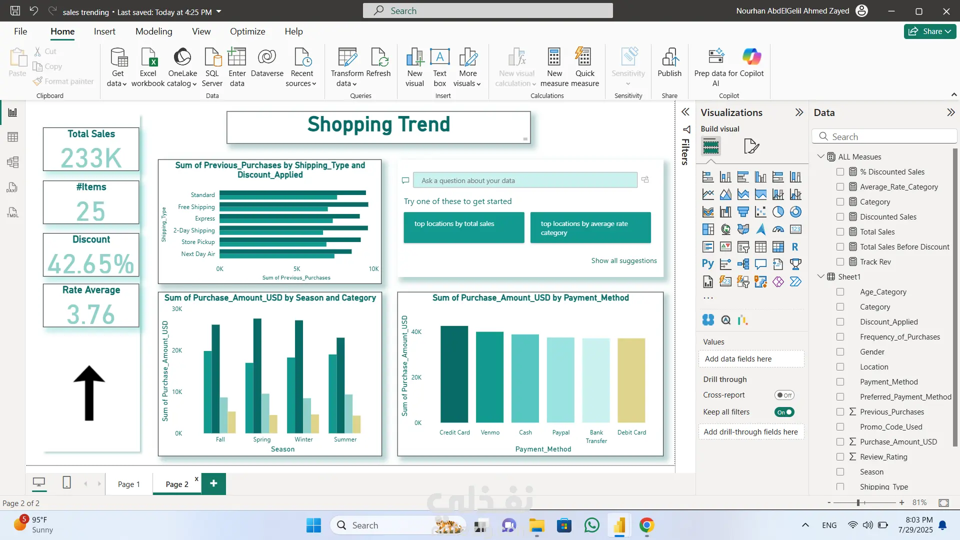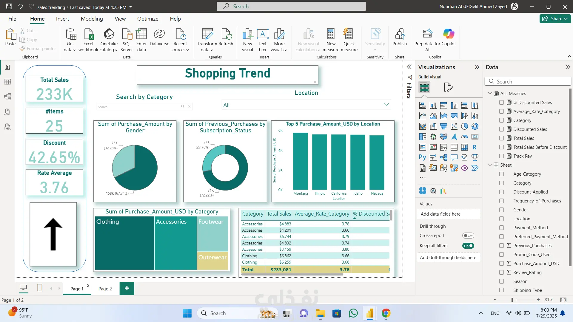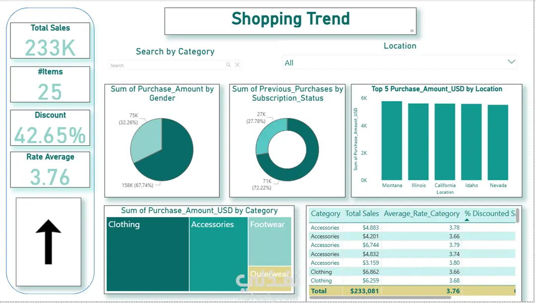 في هذا المشروع، قمت بمعالجة وتحليل مجموعة بيانات حقيقية لاتجاهات التسوق (Shopping Trends Data)، وبنيت نموذجاً متكاملاً (End-to-End Data Pipeline) يحول الأرقام الجامدة إلى رؤى استراتيجية واضحة وقابلة للتنفيذ. أبرز النتائج والمؤشرات التي استخرجتها (من واقع تحليلي للبيانات): لقد صممت لوحات تحكم (Dashboards) تفاعلية تكشف النقاب عن مؤشرات الأداء الرئيسية (KPIs) بدقة متناهية، وإليك مثال لما حققته في هذا التحليل: الأداء المالي: تحليل إجمالي مبيعات بقيمة $233K. سلوك العميل: كشف أن الرجال يمثلون القوة الشرائية الأكبر بنسبة 67.74%. تحليل الولاء: رصد سلوك الـ Non-Subscribers الذين يمثلون 72.22% من إجمالي المشتريات. مؤشرات الجودة: ربط نسبة الخصم (42.65%) بمعدل التقييمات (3.76) لضمان رضا العملاء. الأدوات والمهارات التقنية: SQL Server: لهيكلة وتخزين آلاف السجلات بدقة. Python (Pandas & Seaborn): لتنظيف البيانات والتحليل الإحصائي العميق. Power BI & DAX: لتصميم واجهة تفاعلية احترافية (Clean & Professional Design). ? جاهز لتحويل بياناتك لقصة نجاح؟ البيانات بدون تحليل هي مجرد أرقام، لكن بالتحليل الصح بتتحول لخريطة طريق لبيزنس أقوى. ? ابعتلي رسالة دلوقتي! خلينا ندردش في تفاصيل مشروعك ونبدأ فوراً في تنظيم وتحليل بياناتك بشكل احترافي.