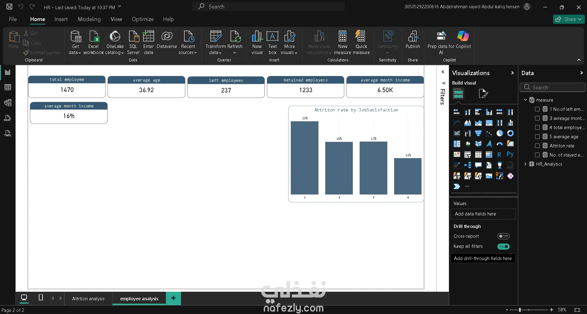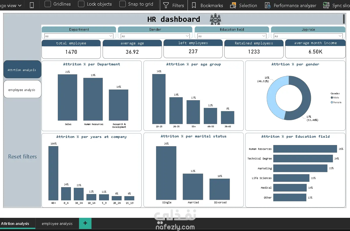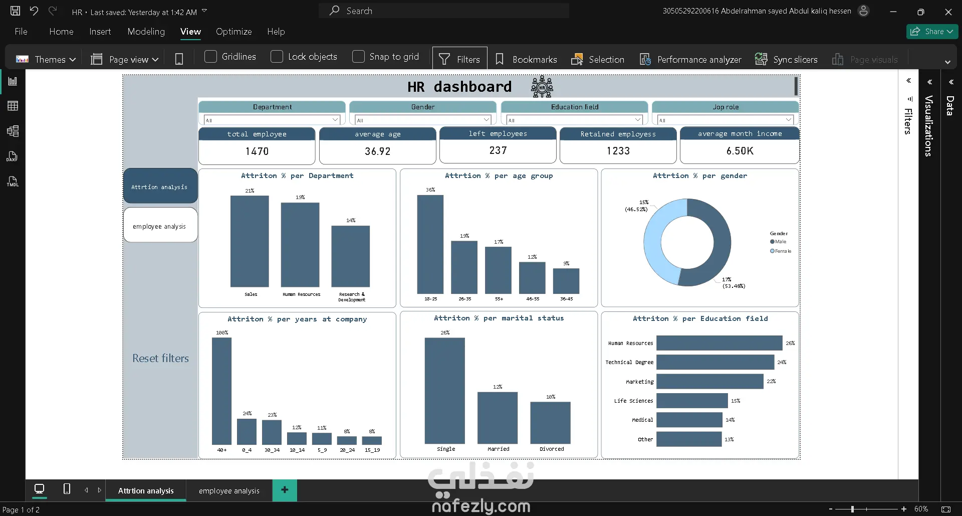 كان هدف المشروع تحليل مشكلة Employee Attrition وفهم: * ليه الموظفين بيمشوا من الشركة * مين أكتر فئة بتسيب الشغل * إيه الأنماط أو الأسباب الشائعة وراء الـ Attrition خلال المشروع استخدمت مجموعة من مميزات Power BI زي: * Slicers لعمل فلاتر تفاعلية * Navigation Page للتنقل بين الصفحات * Drill Down لاستكشاف البيانات بشكل أعمق * Interactive Visualizations لعرض البيانات بشكل أوضح Key Insights: * الموظفين من عمر 18 إلى 35 سنة بيمثلوا تقريبًا 50% من حالات الـ Attrition. * الموظفين اللي مدة عملهم في الشركة من 0 إلى 4 سنوات نسبة تركهم للشركة حوالي 24%، وده بيوضح إن الموظفين الجدد هم الأكثر عرضة لترك العمل. Recommendations: * التركيز على دعم الموظفين الجدد خاصة في أول سنواتهم داخل الشركة. * توفير Training & Development Programs لمساعدتهم على التطور والتأقلم بشكل أسرع. * تحسين Career Growth Opportunities بحيث يكون فيه مسار وظيفي واضح. * مراجعة الرواتب والمزايا لأن تحسين التعويضات ممكن يقلل معدل ترك الموظفين. * تحسين بيئة العمل ورضا الموظفين خصوصًا للفئة العمرية الأكثر عرضة لترك العمل