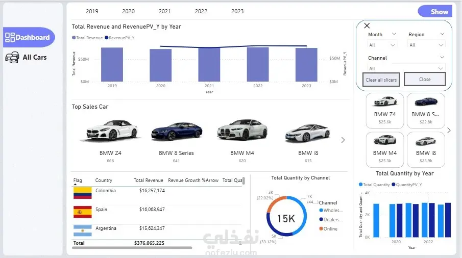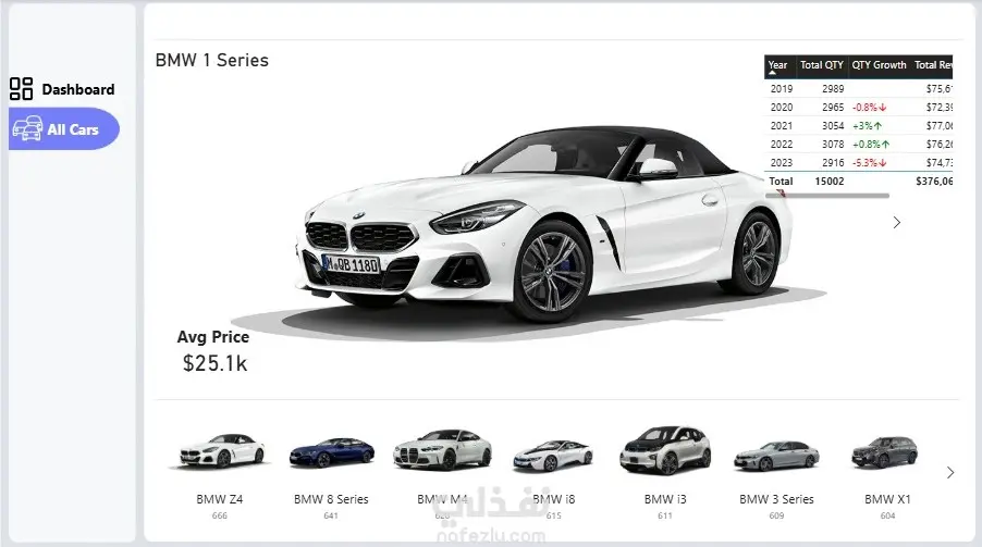 Dashboard تفاعلي لتحليل بيانات مبيعات سيارات BMW، مصمم باستخدام Power Bi يتضمن التصميم: عرضًا بيانيًا يوضح إجمالي الإيرادات واتجاه النمو السنوي خلال عدة سنوات (2019–2023). قسمًا مخصصًا لأكثر السيارات مبيعًا مثل BMW Z4 وBMW 8 Series وBMW M4. تحليلًا تفصيليًا حسب الدول مع إظهار الإيرادات ونسب النمو. مخططًا دائريًا يوضح توزيع المبيعات حسب قنوات البيع (أونلاين – موزعين – جملة). إمكانية التفاعل من خلال فلاتر متعددة مثل الشهر، المنطقة، وقناة البيع. شاشة تفصيلية لمنتج معين تعرض صورة السيارة ومتوسط السعر وأداء المبيعات السنوي. التصميم يتميز بواجهة حديثة وسهلة الاستخدام، تساعد على تحويل البيانات المعقدة إلى معلومات واضحة تدعم اتخاذ القرار.