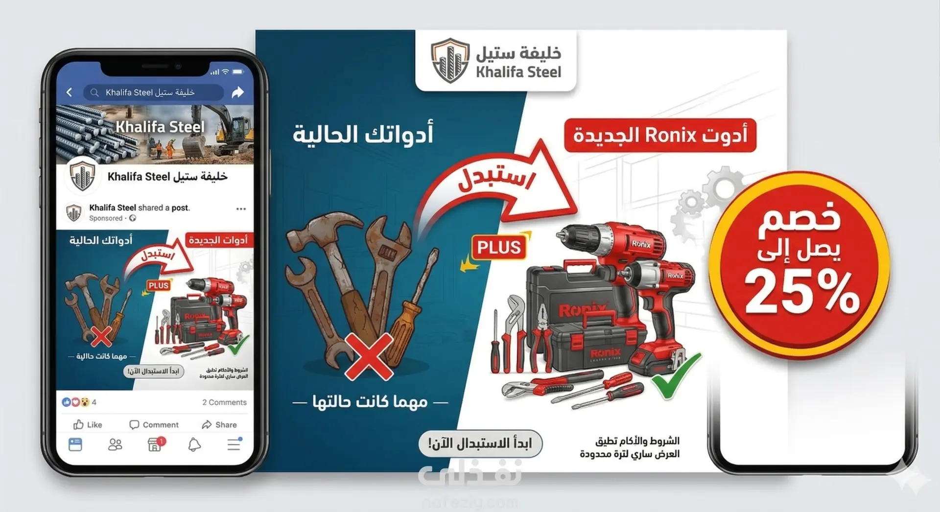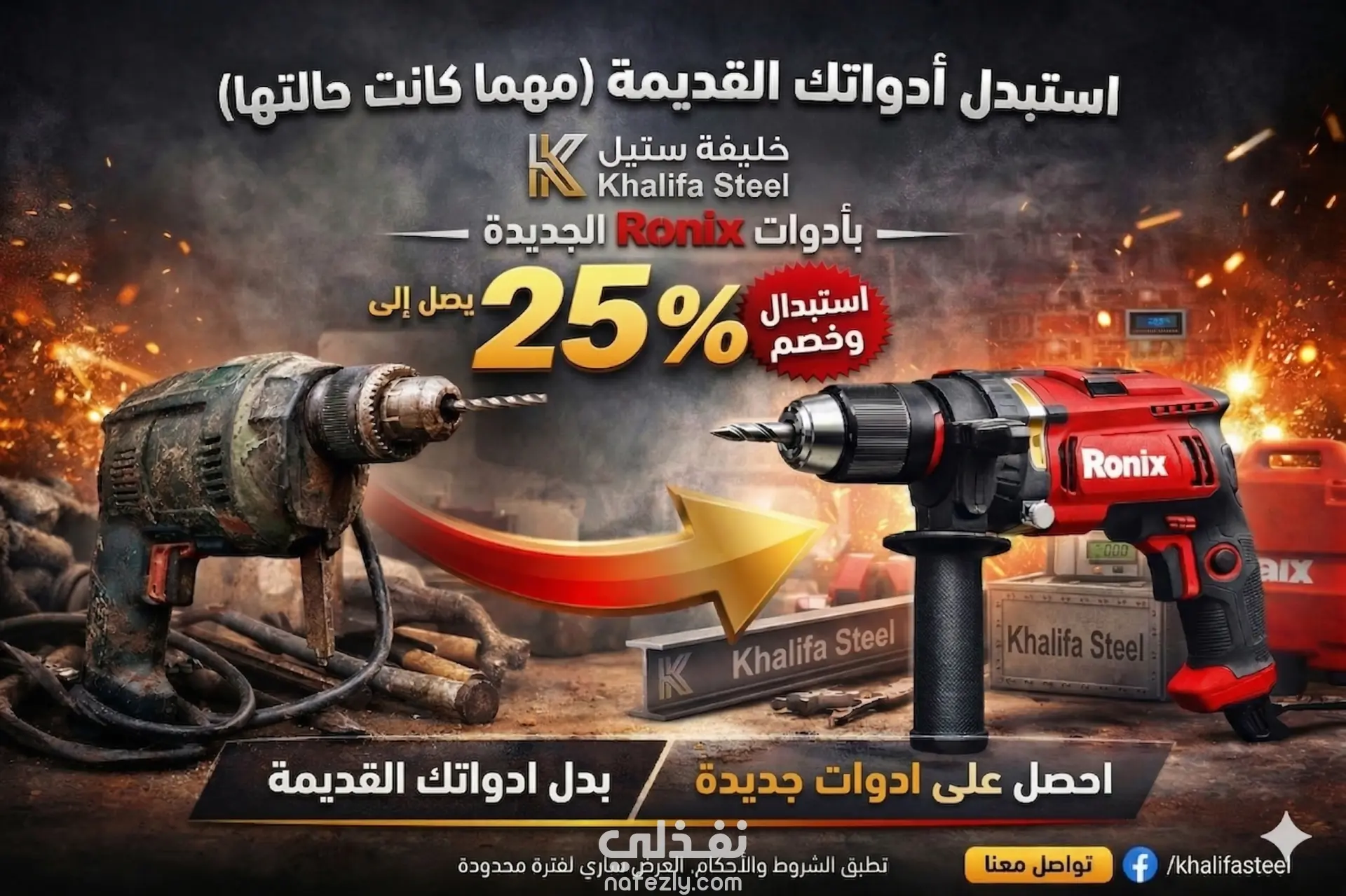 الجانب الأيمن (الجديد): يبرز شنيور ماركة Ronix بتصميمه العصري باللونين الأحمر والأسود، يبدو لامعاً وقوياً. الإضاءة هنا قوية (Spotlight) مع وجود شرر متطاير يوحي بالقوة والعمل الشاق.