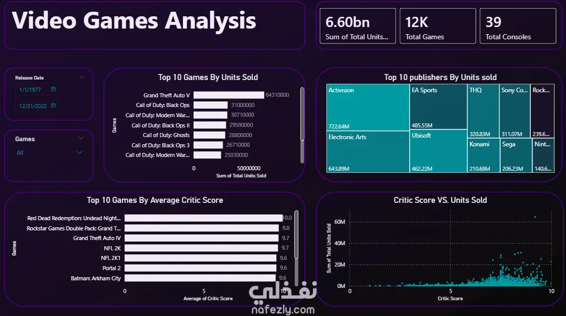 مشروع تحليل بيانات يهدف إلى استخراج رؤى استراتيجية من قاعدة بيانات ضخمة لمبيعات الألعاب عالمياً. ركز العمل على تحويل "بيانات خام" معقدة إلى قصة رقمية دقيقة من خلال مراحل متقدمة من التنظيف والمعالجة. مرحلة معالجة البيانات (ورا الكواليس): الفلترة الذكية: تصفية 64 ألف صف لاستبعاد "الضوضاء" والبيانات الصفرية، والتركيز على 17,505 صفاً ذات قيمة تحليلية. معالجة القيم المفقودة: استخدام الوسيط (Median) لتعويض نقص تقييمات النقاد وتواريخ الإصدار بناءً على نوع اللعبة ومنصة التشغيل لضمان اتساق الجدول الزمني. أبرز النتائج والمؤشرات (Insights): حجم السوق: إجمالي مبيعات 6.6 مليار نسخة عبر 39 منصة تشغيل، وتصدرت PS2 القائمة بـ 1.03 مليار نسخة. القمة التاريخية: سجل عام 2008 ذروة المبيعات بـ 538.8 مليون نسخة مباعة. تحليل الأنواع والناشرين: تصدرت ألعاب Sports المبيعات بـ 1.19 مليار نسخة، وجاءت شركة Activision كأفضل ناشر بإجمالي 772.6 مليون. التوزيع الجغرافي: سيطرت أمريكا الشمالية (NA Sales) على 51.12% من السوق العالمي. الأداء الفردي: تصدرت GTA V المبيعات بـ 64 مليون نسخة وتقييم نقاد 9.20. الهدف من المشروع: تحويل "ماذا حدث تاريخياً" إلى "رؤى واضحة" تدعم فهم اتجاهات السوق وتفضيلات اللاعبين عالمياً.