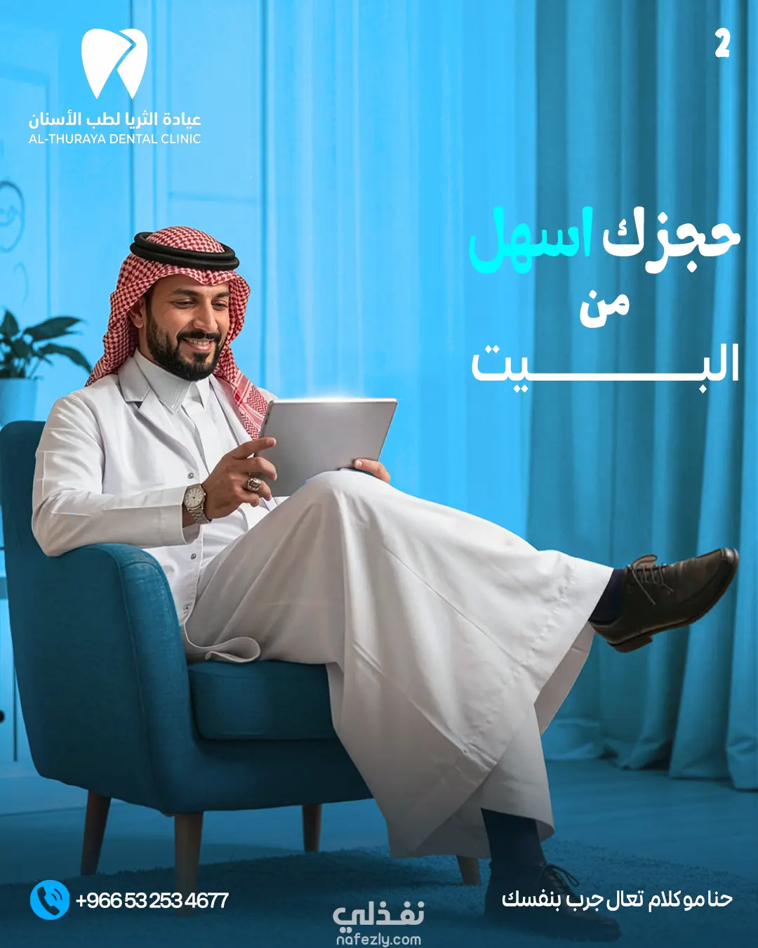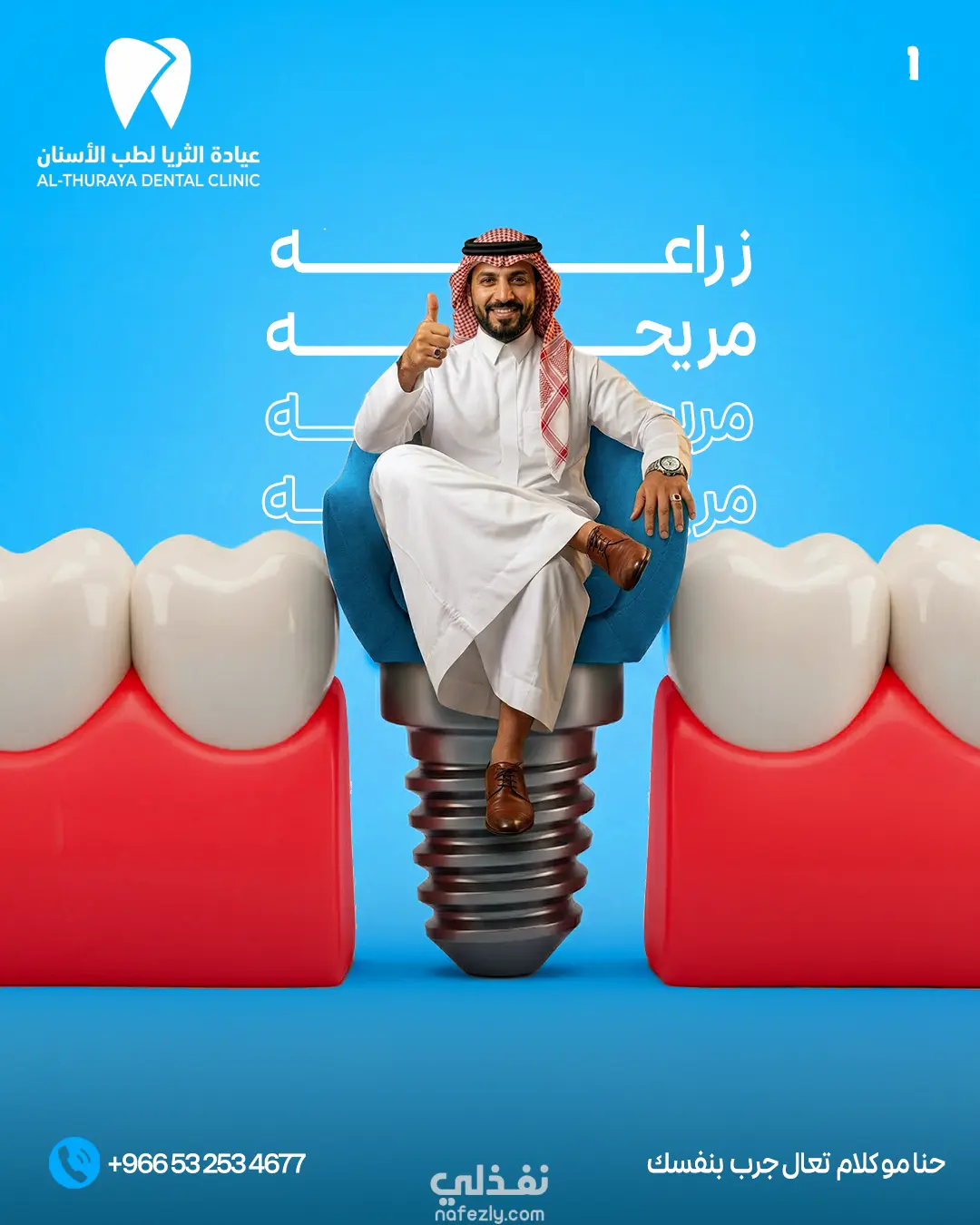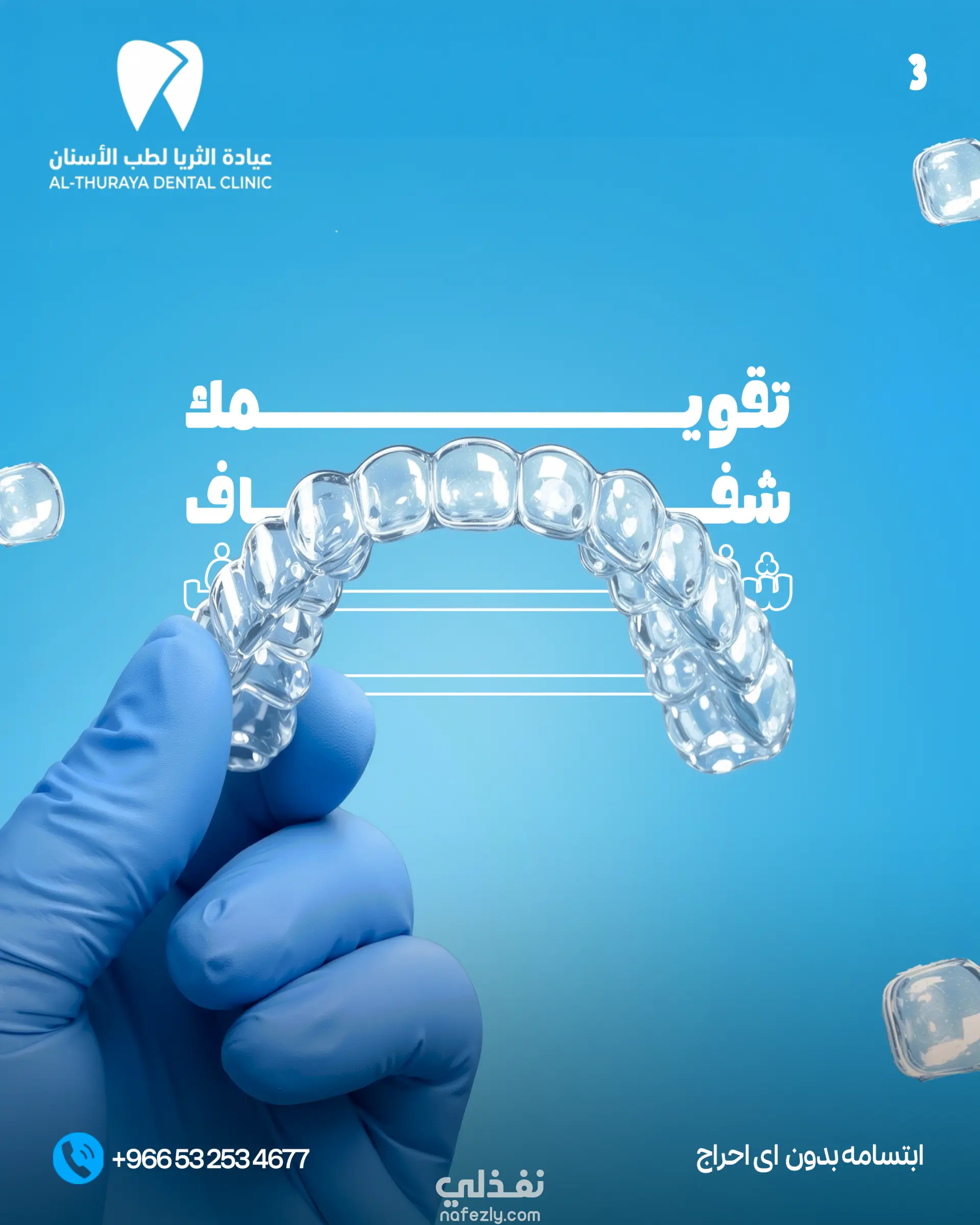 تحت الانشاءتم تنفيذ تصميم إعلان بصري احترافي لعيادة الثريا لطب الأسنان، يهدف إلى الترويج لخدمة تقويم الأسنان الشفاف بأسلوب عصري وجذاب. يعتمد التصميم على إبراز المنتج بشكل واضح من خلال صورة عالية الجودة للتقويم الشفاف، مع توظيف خلفية زرقاء متدرجة تعكس الطابع الطبي وتعزز الشعور بالثقة والاحترافية.