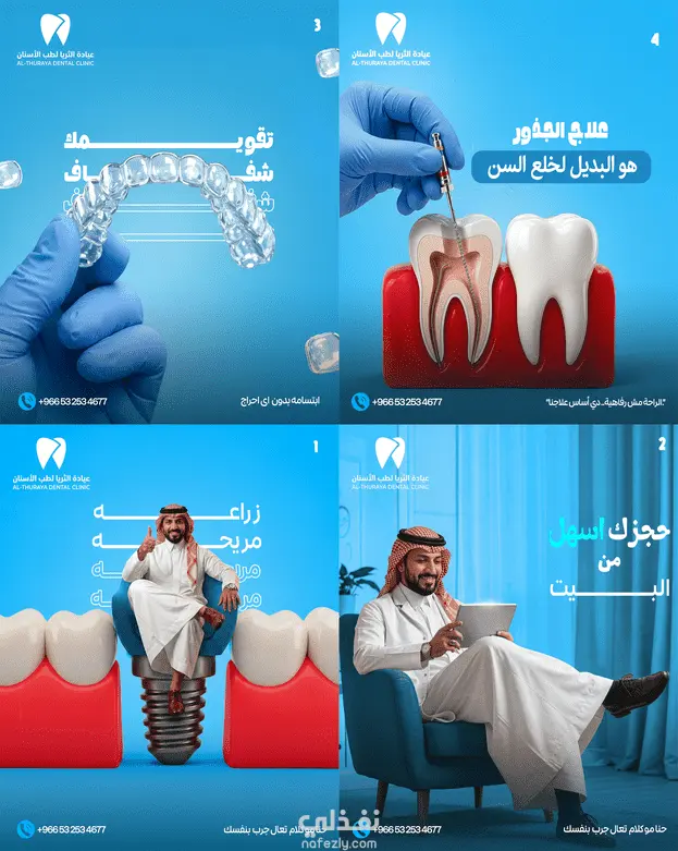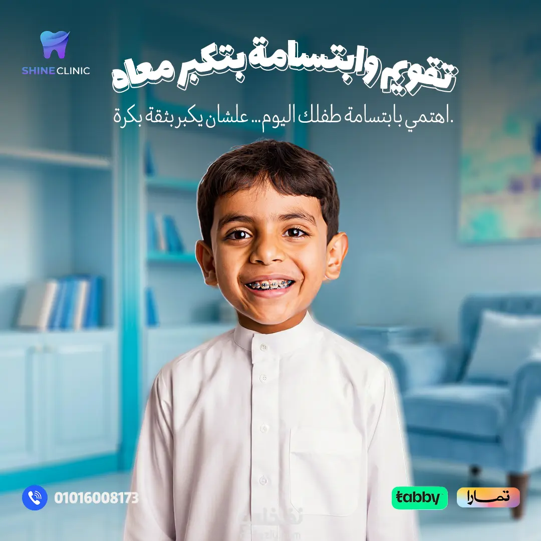 تم دمج الهوية البصرية للعيادة بشكل متناسق، مع استخدام عبارات تسويقية مؤثرة مثل "تقويم شفاف" و"ابتسامة بدون أي إحراج" لجذب انتباه الجمهور المستهدف. كما تم توزيع العناصر البصرية والنصية بطريقة مدروسة تضمن وضوح الرسالة وسهولة القراءة، مع إبراز بيانات التواصل لتسهيل الوصول والحجز.