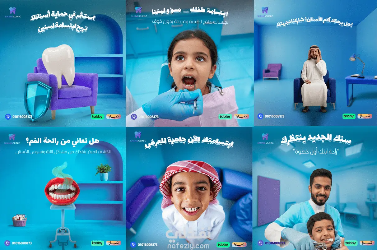 "تصميم حملة إعلانية شاملة لعيادات Shine Clinic لطب الأسنان، تهدف إلى بناء الثقة مع الجمهور وتسليط الضوء على الخدمات الطبية بأسلوب مبتكر ومريح بصرياً.