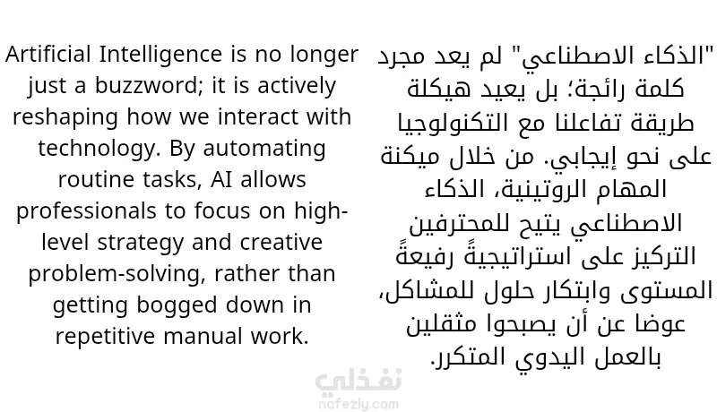 نموذج لترجمة فقرة تقنية تتناول دور الذكاء الاصطناعي في بيئة العمل من الإنجليزية إلى العربية. تم التركيز على نقل المصطلحات بدقة، مع صياغة عربية رصينة ومراجعة نحوية دقيقة.