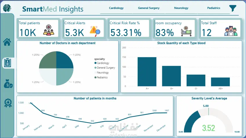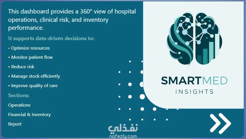 تم إنشاء لوحة قيادة (Dashboard) تفاعلية وشاملة تهدف إلى تقديم رؤية بـ 360 درجة لعمليات المستشفى، تهدف إلى دعم اتخاذ القرار المبني على البيانات (Data-Driven Decisions). يركز المشروع على تحسين الكفاءة التشغيلية، مراقبة المخاطر السريرية، وإدارة الموارد والمخزون الطبي بدقة عالية. أبرز المميزات والوظائف (Key Features): تحليل العمليات التشغيلية: مراقبة تدفق المرضى (أكثر من 10 آلاف مريض) وتوزيع الكادر الطبي على التخصصات (قلب، جراحة، أعصاب، أطفال). إدارة المخاطر (Clinical Risk): نظام تنبيهات ذكي يسجل الحالات الحرجة، حيث أظهرت البيانات معدل خطورة يبلغ 53.31%. إدارة الموارد والمخزون: تتبع دقيق للأدوية (مثل Panadol, Insulin) مع نظام تنبيه عند انخفاض المخزون (Low Stock Count). التحليل المالي: مراقبة الإيرادات الإجمالية التي بلغت 13.88 مليون وتصنيف حالة الدفع (مدفوع/معلق). بنك الدم وغرف الإقامة: مراقبة مخزون فصائل الدم ونسبة إشغال الغرف التي وصلت لـ 83%. قسم التقارير والتوصيات: توليد تقارير آلية تقدم حلولاً مباشرة مثل (زيادة طاقم العمل، إضافة أسرة، وتحسين إعادة التموين). الأدوات المستخدمة: Power BI / Tableau (اختاري الأداة التي صممتِ بها) لمعالجة البيانات وتصميم الواجهات. Data Visualization: استخدام الرسوم البيانية المتنوعة (Donut Charts, Bar Charts, Line Graphs, Gauges). Business Analysis: استخراج توصيات قابلة للتنفيذ بناءً على الأرقام.