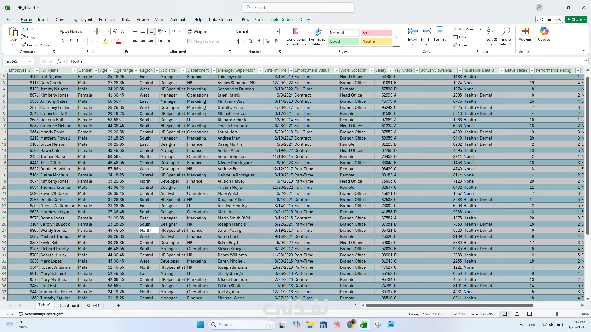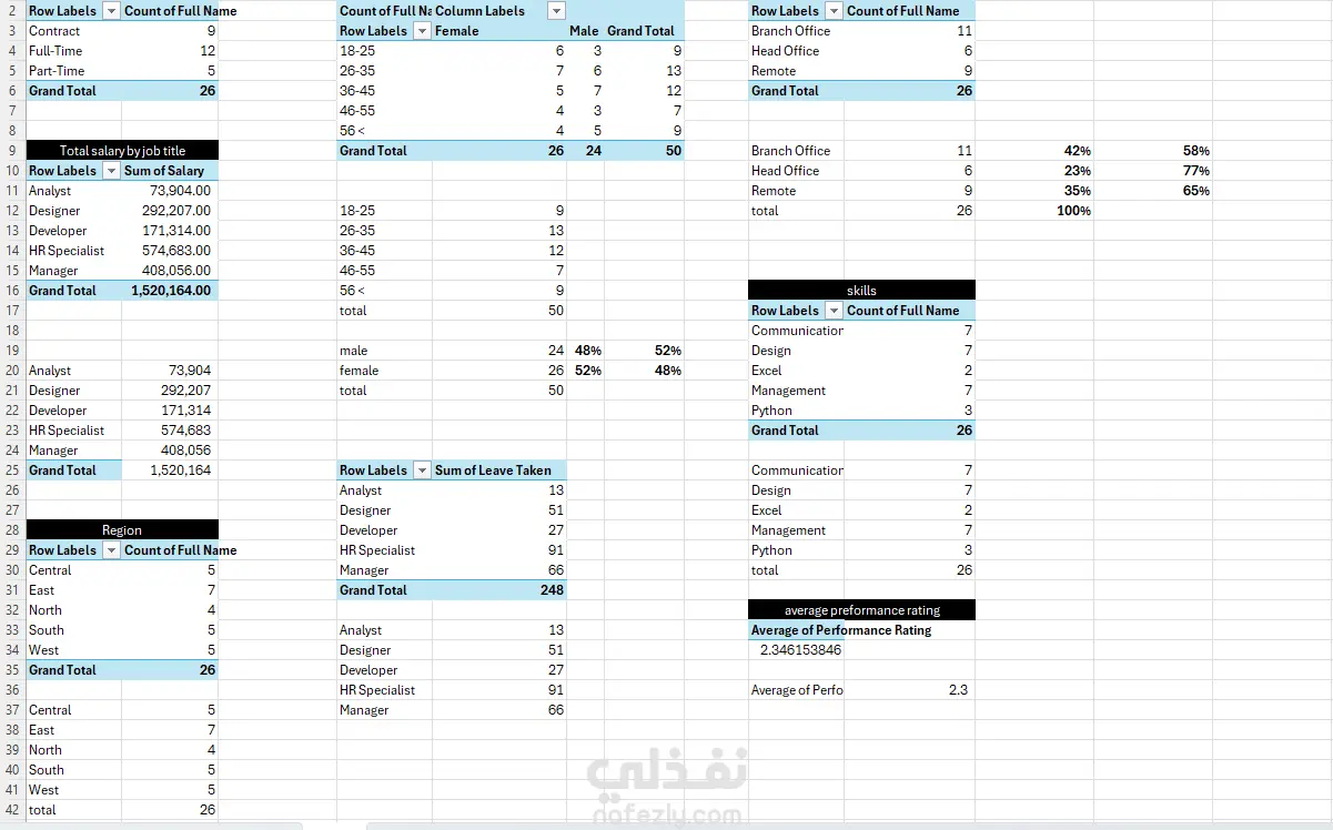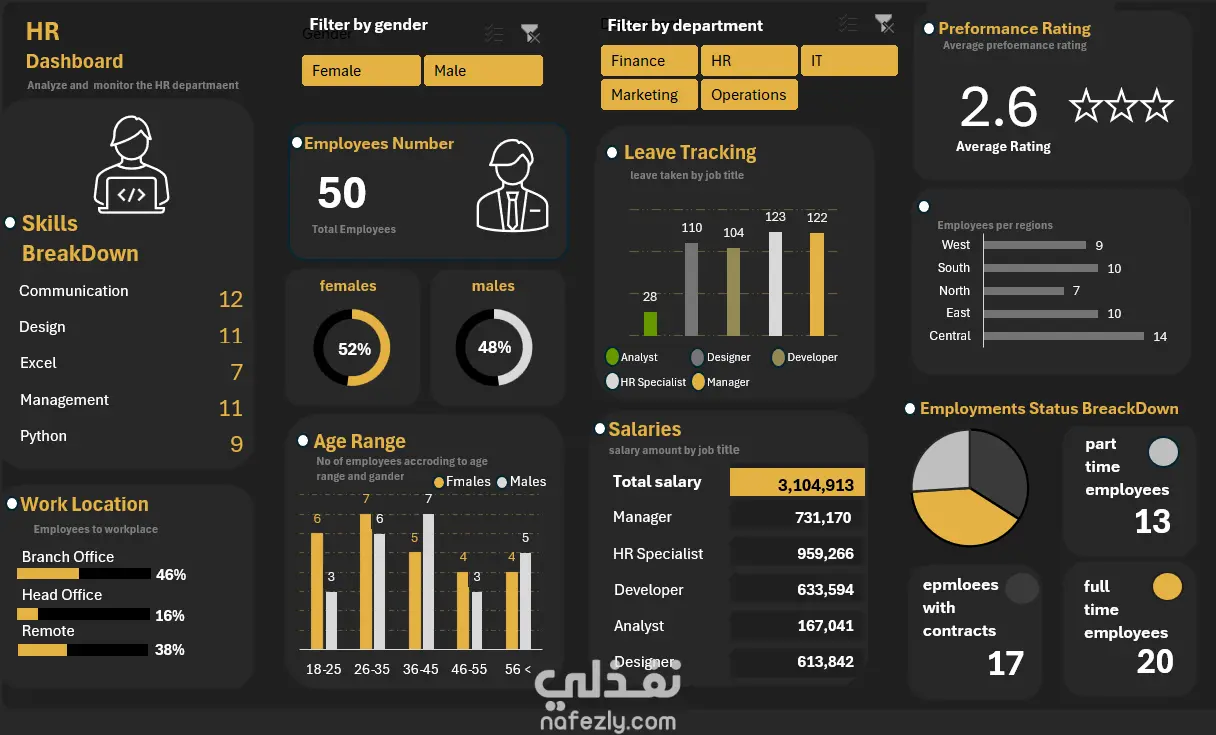 قمت بتنفيذ مشروع تحليل بيانات الموارد البشرية باستخدام Excel بهدف استخراج رؤى تساعد في تحسين أداء الموظفين ودعم اتخاذ القرار داخل الشركات. اعتمد المشروع على تحويل البيانات الخام إلى تقارير وتحليلات واضحة من خلال استخدام أدوات Excel المختلفة، مما يساعد الإدارة على فهم الوضع الحالي واتخاذ قرارات مبنية على بيانات دقيقة. هدف المشروع تحليل أداء الموظفين فهم توزيع الموارد البشرية داخل الشركة تحديد المشكلات المتعلقة بالرواتب والإجازات تحسين كفاءة الإدارة من خلال البيانات الأدوات المستخدمة Microsoft Excel Pivot Tables Charts Data Cleaning Techniques Functions (IF, VLOOKUP, SUMIFS) مكونات التحليل تحليل عدد الموظفين وتوزيعهم حسب النوع تحليل الفئات العمرية تحليل الرواتب حسب الوظائف تحليل الإجازات حسب الدور الوظيفي تقييم أداء الموظفين تحليل توزيع الموظفين جغرافيًا تحليل المهارات داخل الفريق أهم النتائج متوسط تقييم الأداء بلغ 2.6 مما يشير إلى انخفاض نسبي في الأداء وجود فجوة في الرواتب بين الوظائف المختلفة ارتفاع معدل الإجازات في بعض الوظائف الأساسية ضعف في المهارات التقنية مثل Excel و Python توزيع غير متوازن للموظفين بين المناطق التوصيات تحسين نظام تقييم الأداء تدريب الموظفين على المهارات التقنية إعادة هيكلة الرواتب لتحقيق عدالة أكبر تحسين توزيع الموظفين حسب احتياجات العمل تقليل الاعتماد على الإجازات في الوظائف الحيوية القيمة المضافة يساعد هذا التحليل في تحسين الإنتاجية وتقليل التكاليف ودعم اتخاذ قرارات إدارية أكثر دقة بناءً على بيانات حقيقية
