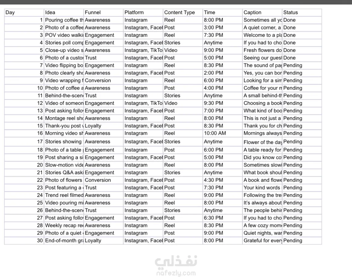 هذا نموذج لتقويم محتوى أسبوعي قمت بإعداده كجزء من أعمالي السابقة. يوضح طريقة تنظيم المنشورات، الأفكار المبتكرة للنصوص (Captions)، وجدول النشر الأسبوعي الذي يضمن تفاعل متابعين مستمر. تم تصميم هذا التقويم بناءً على خبرتي العملية في إدارة محتوى علامات تجارية متنوعة، مع مراعاة تناسق الأسلوب والهوية البصرية لكل حساب