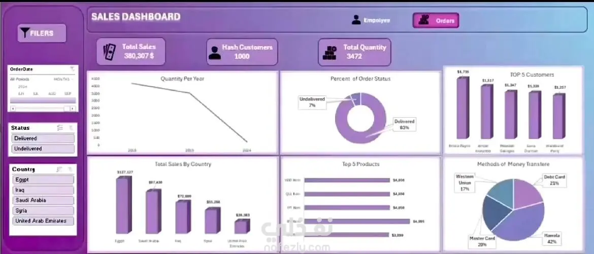 مرحبًا بك عزيزي العميل، يسعدني اهتمامك بعملي. هذا المشروع عبارة عن لوحات تحكم تفاعلية لتحليل بيانات المبيعات والموظفين، تم تصميمها لمساعدة الشركات على متابعة الأداء واتخاذ القرارات بشكل أسرع وأكثر دقة اعتمادًا على بيانات واضحة ومنظمة. تم تنفيذ المشروع باستخدام Microsoft Excel مع تطبيق Data Modeling عبر Power Pivot لبناء العلاقات بين الجداول وضمان دقة الحسابات واستخراج مؤشرات احترافية. ــــــــــــــــــــــــــــــ أولًا: Sales Dashboard لوحة تحكم متكاملة لتحليل أداء المبيعات تتضمن: • عرض إجمالي المبيعات (Total Sales) وإجمالي الكميات وعدد العملاء. • تحليل المبيعات حسب الدولة لتحديد الأسواق الأعلى أداءً. • عرض أفضل العملاء (Top Customers) وتأثيرهم على الإيرادات. • تحليل أفضل المنتجات مبيعًا (Top Products). • توزيع حالات الطلبات (Delivered / Undelivered). • تحليل طرق الدفع الأكثر استخدامًا. • متابعة الأداء عبر السنوات. • فلاتر تفاعلية حسب التاريخ، الدولة، وحالة الطلب. الفائدة: تساعد الإدارة في تحديد الأسواق الأكثر ربحية، تحسين عمليات التسليم، ودعم قرارات التسويق والمخزون بناءً على بيانات دقيقة. ــــــــــــــــــــــــــــــ ثانيًا: Employees Analysis Dashboard لوحة تحكم لتحليل بيانات الموظفين وأدائهم تشمل: • إجمالي عدد الموظفين. • متوسط الرواتب. • متوسط التقييمات. • توزيع الموظفين حسب نوع التوظيف (Full-Time / Contract / Part-Time / Hourly). • تحليل متوسط الرواتب حسب القسم. • أفضل الموظفين من حيث التقييم. • تحليل إنتاجية فريق المبيعات (Sales Quantity by Employee). • فلاتر حسب القسم ونوع التوظيف. الفائدة: تمكن الإدارة من تقييم الأداء، دعم قرارات الموارد البشرية، وتحسين نظام الحوافز والتدريب. ــــــــــــــــــــــــــــــ الأدوات المستخدمة: • Microsoft Excel • Power Pivot (Data Modeling & Relationships) • Pivot Tables • Slicers & Interactive Filters • KPI Design & Dashboard Formatting إذا كنت تبحث عن لوحة تحكم احترافية تساعدك على فهم بياناتك بسهولة واتخاذ قرارات مبنية على أرقام واضحة، يسعدني العمل معك.