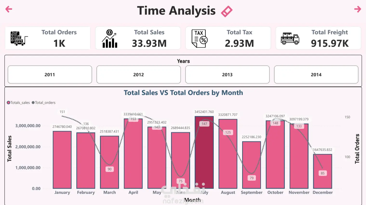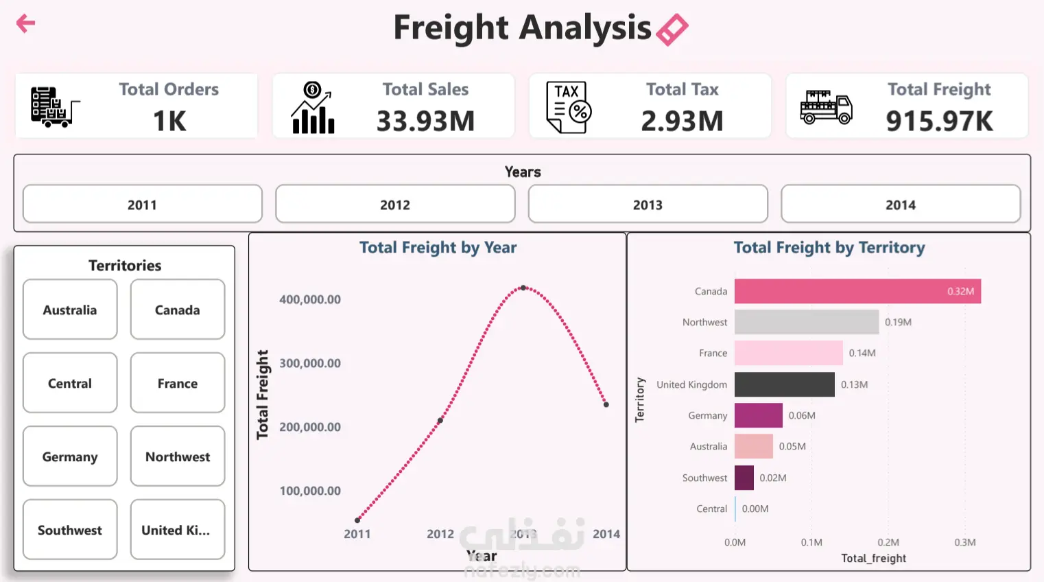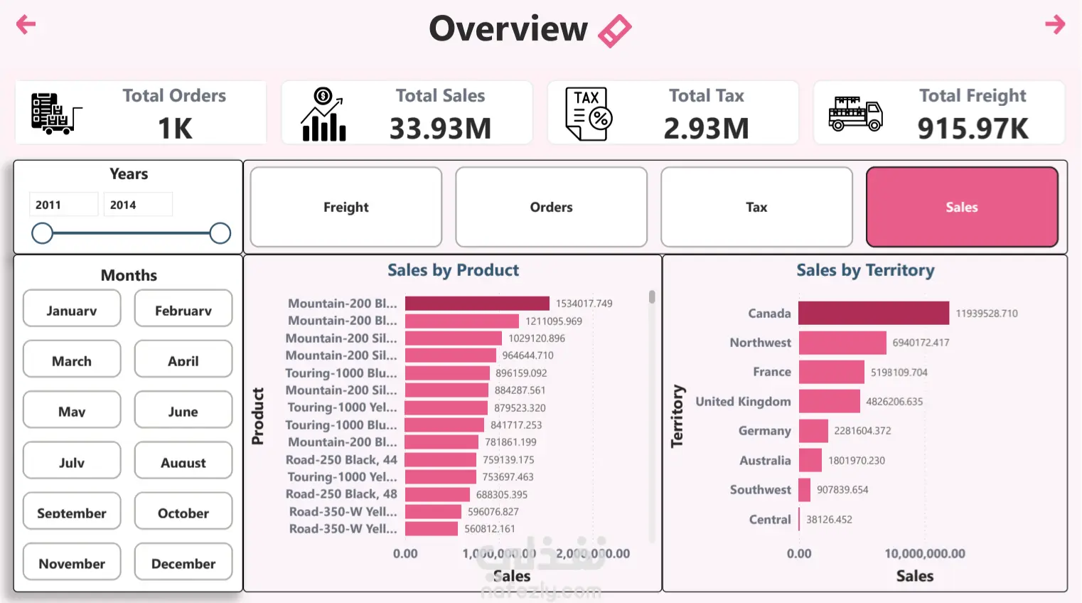 للإجابة على هذه الأسئلة، قمت بتطوير لوحة تحكم تفاعلية متقدمة (Advanced Sales Dashboard) لتحليل أداء المبيعات، الطلبات، والضرائب، وتكاليف الشحن (Freight) لشركة تجارية خلال الفترة من 2011 إلى 2014. الهدف هو تمكين الإدارة العليا من مراقبة المؤشرات الرئيسية (KPIs) واتخاذ قرارات استراتيجية لزيادة الأرباح وتقليل التكاليف.