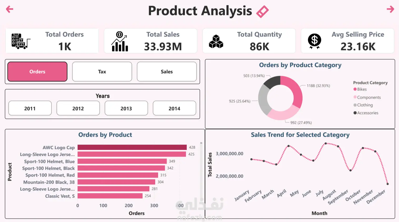 أداء المنتجات: استحوذت فئة "الدراجات - Bikes" على النصيب الأكبر من المبيعات، وكان منتج (Mountain-200) بإصداراته المختلفة هو الأكثر مبيعاً والأعلى تحقيقاً للإيرادات.