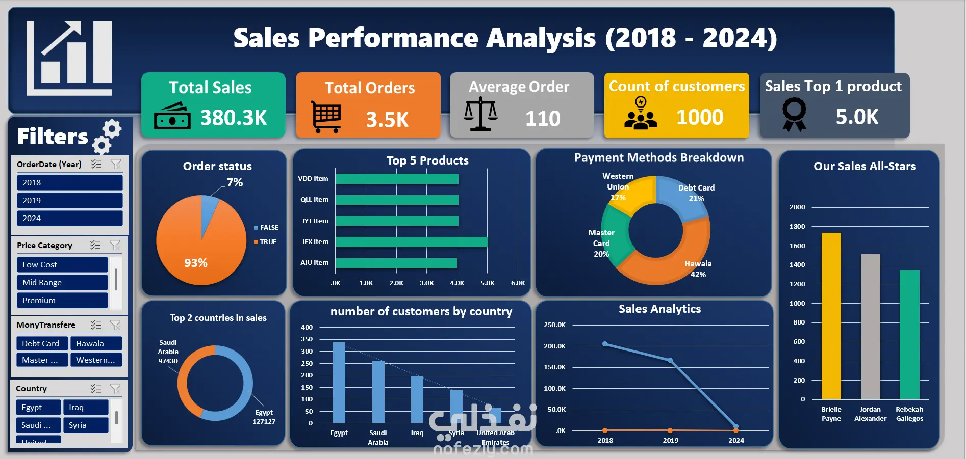 قمت بتصميم لوحة تحكم تفاعلية وشاملة باستخدام برنامج Excel لتحليل بيانات المبيعات في عدة دول عربية (مصر، السعودية، العراق، وغيرها)، حيث تضمن المشروع: مؤشرات الأداء الرئيسية (KPIs): عرض إجمالي المبيعات (380K)، وعدد الطلبات (3.5K)، ومتوسط قيمة الطلب، مع تحديد المنتج الأكثر مبيعاً. تحليل طرق الدفع: توضيح نسب استخدام طرق الدفع المختلفة (حوالة، بطاقات بنكية، Western Union) حيث أظهر التحليل أن الـ "Hawala" هي الأكثر استخداماً بنسبة 42%. التوزيع الجغرافي: تحليل عدد العملاء والمبيعات حسب الدول، مع التركيز على الأسواق الرئيسية (مصر والسعودية). أداء المنتجات والموظفين: تحديد أفضل 5 منتجات مبيعاً وتكريم أفضل الموظفين أداءً (Sales All-Stars). تحليل الاتجاهات (Trends): رسم بياني يوضح تطور المبيعات عبر السنوات لتحليل النمو أو التراجع. نظام الفلترة التفاعلي: إضافة Slicers للتحكم في عرض البيانات حسب (السنة، فئة السعر، طريقة الدفع، والدولة) لتسهيل استخراج تقارير مخصصة في ثوانٍ