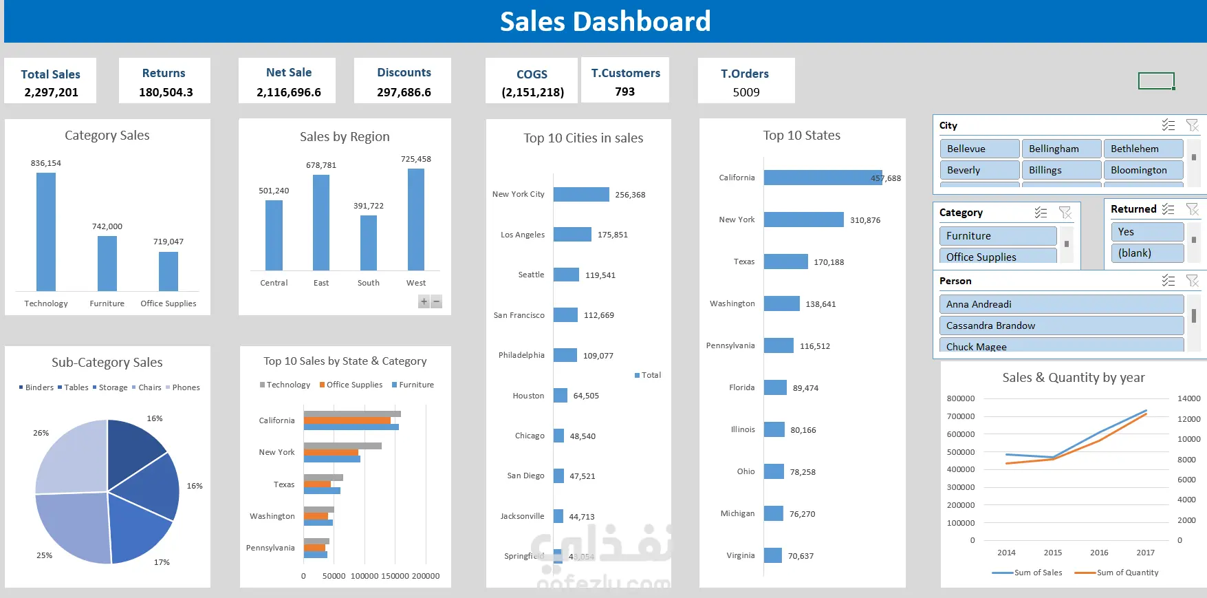 مشروع تحليل بيانات المبيعات يهدف إلى دراسة أداء المبيعات واكتشاف الأنماط والعوامل المؤثرة في الإيرادات عبر عدة أبعاد مختلفة مثل الفئات والمنتجات والمناطق الجغرافية والمدن والولايات. تم العمل على تنظيف البيانات ومعالجتها وتحليلها لاستخراج مؤشرات الأداء الرئيسية مثل إجمالي المبيعات، صافي المبيعات، المرتجعات، الخصومات، تكلفة البضائع المباعة، وعدد الطلبات والعملاء. يشمل المشروع تحليل توزيع المبيعات حسب الفئات والمنتجات الفرعية، بالإضافة إلى تحليل الأداء الجغرافي لمعرفة المناطق والمدن الأكثر تحقيقًا للمبيعات. كما يتضمن دراسة أفضل الولايات والمدن من حيث حجم المبيعات، وتحليل اتجاهات المبيعات والكميات عبر السنوات لاكتشاف النمو والتغيرات في الأداء. تم في نهاية المشروع تحويل نتائج التحليل إلى تمثيلات بصرية واضحة وتفاعلية تساعد على فهم البيانات بسهولة واستخلاص رؤى عملية يمكن أن تدعم اتخاذ القرارات وتحسين استراتيجيات المبيعات.