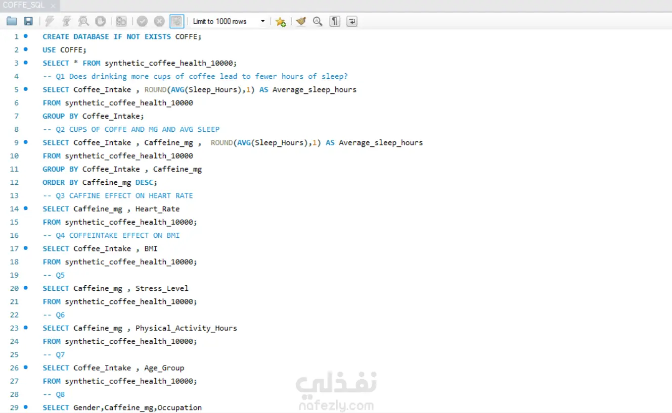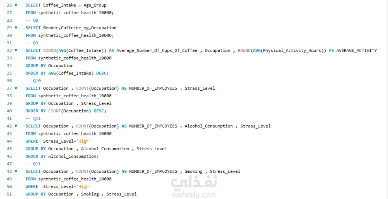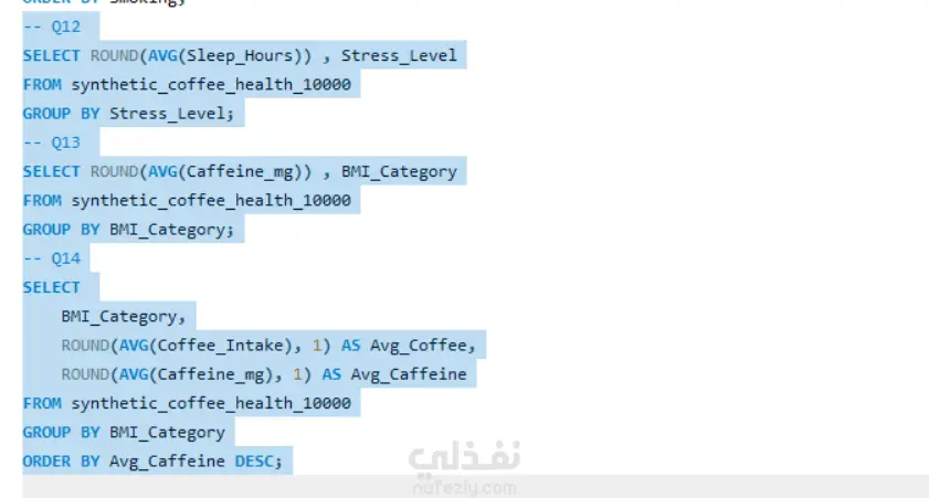 قمت بتنفيذ مشروع تحليل بيانات باستخدام SQL على مجموعة بيانات تحتوي على 10,000 سجل متعلق بعادات استهلاك القهوة وتأثيرها على الصحة. شمل العمل: تنظيف البيانات (Data Cleaning) والتأكد من خلوها من القيم غير الصحيحة استكشاف البيانات (Exploratory Data Analysis) باستخدام SQL تحليل العلاقة بين عدد أكواب القهوة اليومية ومتوسط ساعات النوم دراسة تأثير الكافيين على مؤشرات صحية مثل معدل ضربات القلب (Heart Rate)، مؤشر كتلة الجسم (BMI)، ومستوى التوتر (Stress Level) تحليل سلوكيات مختلفة مثل التدخين، استهلاك الكحول، والنشاط البدني وربطها بمستويات التوتر استخراج مؤشرات أداء (KPIs) وإجابات على مجموعة من الأسئلة التحليلية باستخدام الاستعلامات (Queries) تم الاعتماد على استعلامات SQL مثل: GROUP BY AVG aggregation WHERE filtering ORDER BY لاستخراج insights تساعد في فهم العلاقة بين نمط الحياة واستهلاك الكافيين. النتائج ساعدت في توضيح أنماط سلوكية وعلاقات بين متغيرات مختلفة مثل استهلاك القهوة، النوم، التوتر، والصحة العامة.