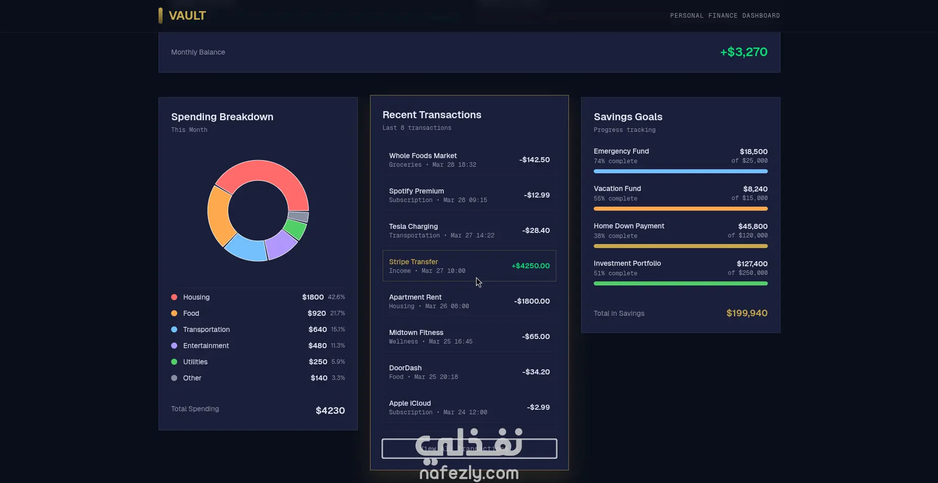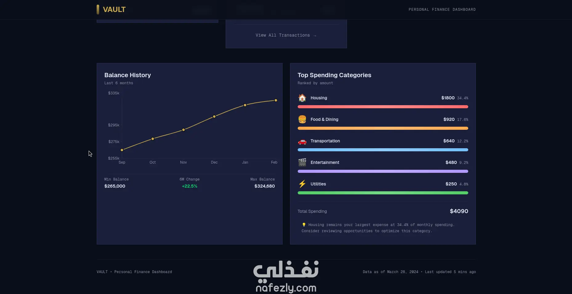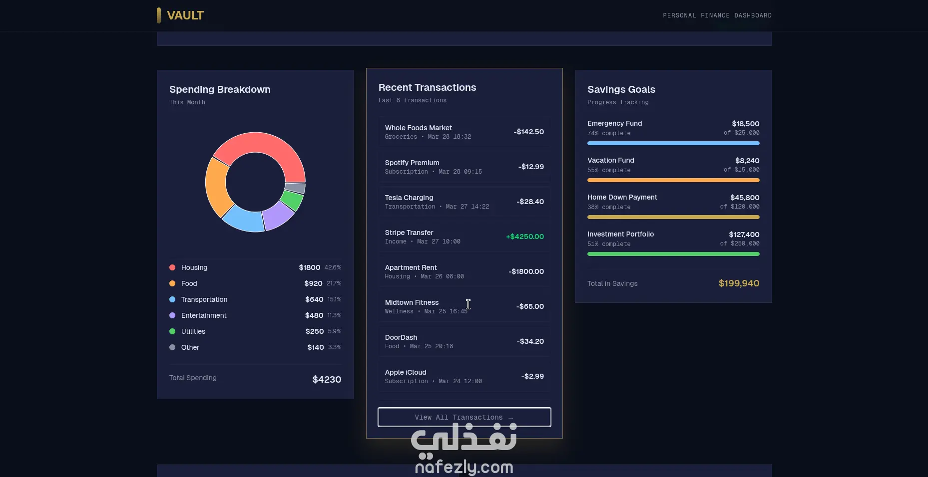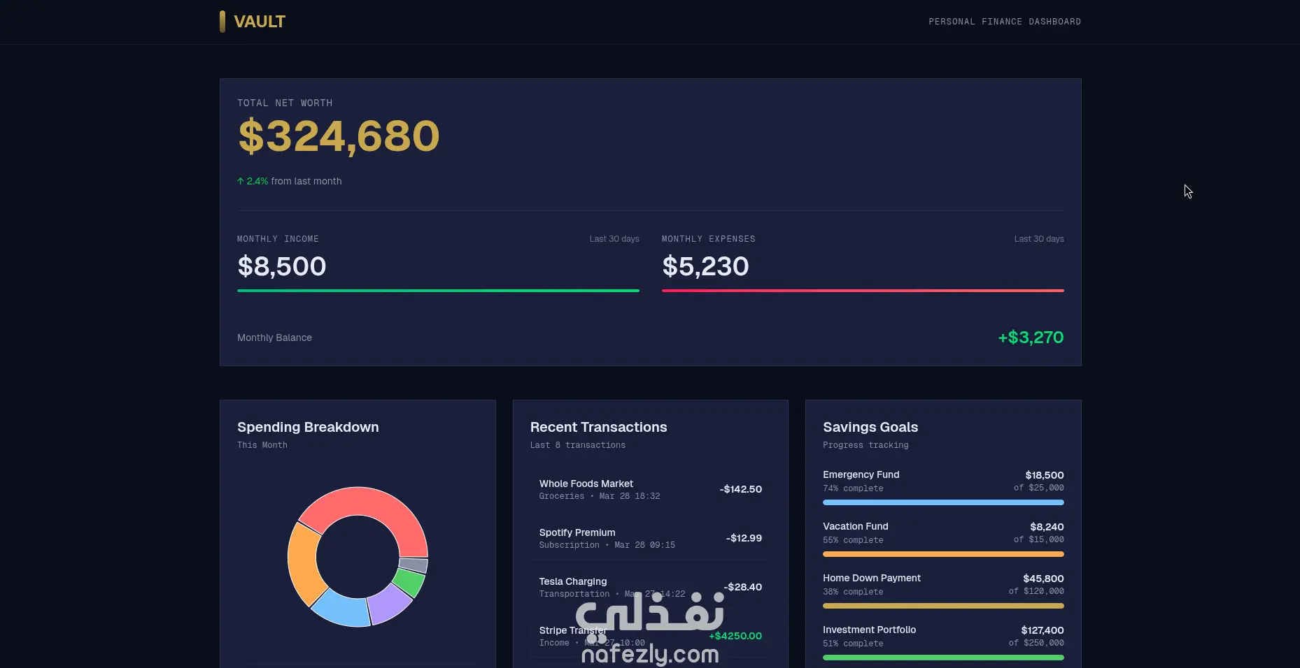 لوحة تحكم مالية شخصية مبنية بـ React، تعرض صافي الثروة، الدخل والمصروفات، تحليل الإنفاق، وسجل المعاملات — كل ده بتصميم داكن فاخر مستوحى من تطبيقات البنوك العالمية. الواجهة مليانة تفاصيل دقيقة: أرقام بتتحرك عند التحميل، رسوم بيانية متحركة، وكروت بتتفاعل مع المستخدم. مثالي لأي مشروع مالي أو تطبيق إدارة ميزانية.