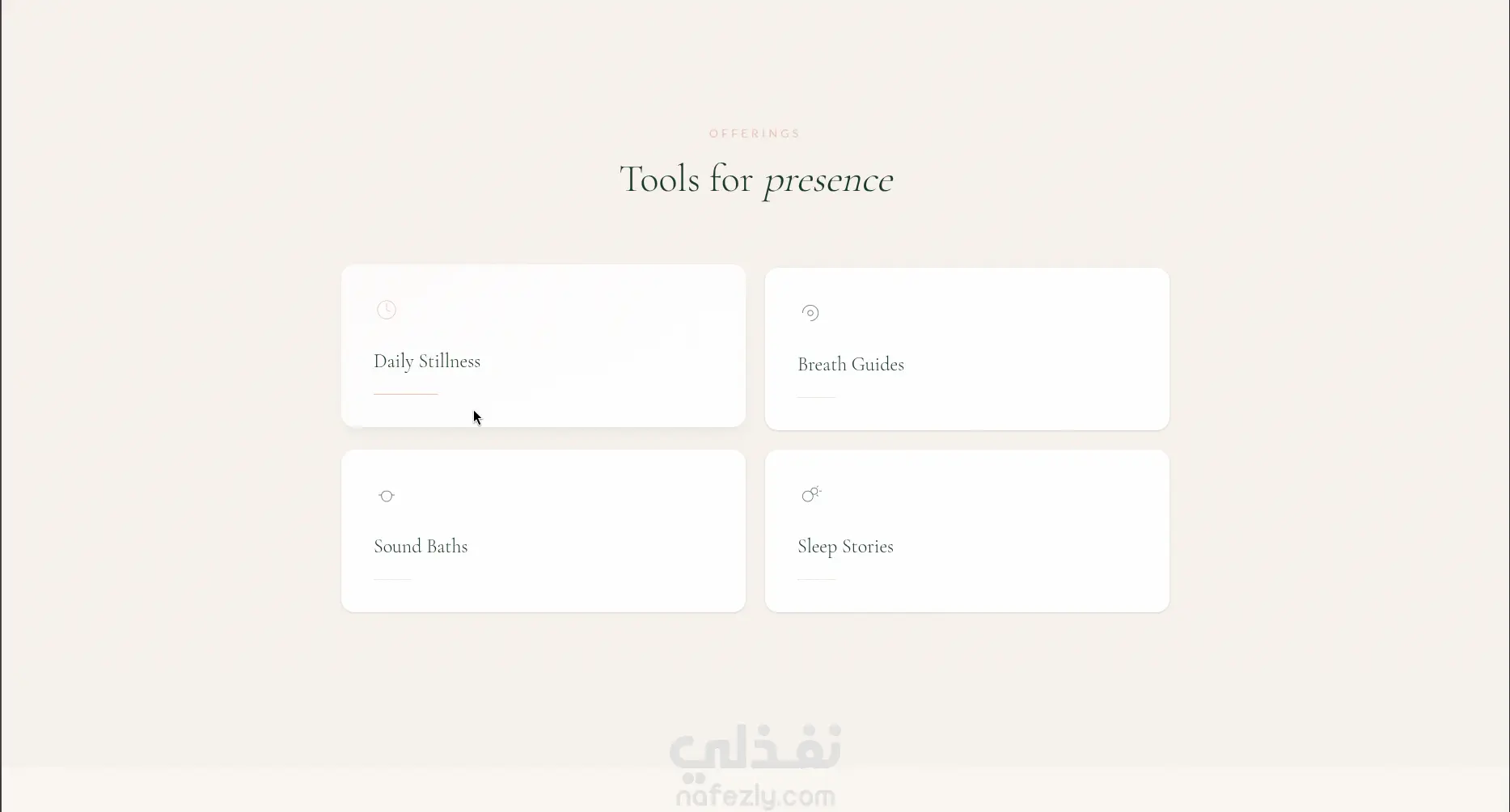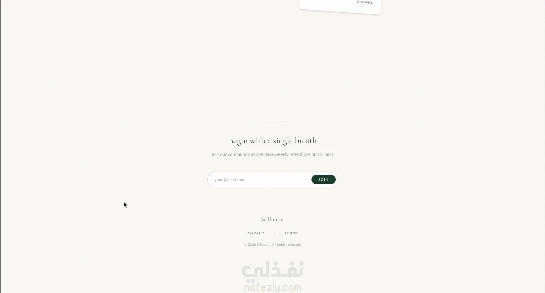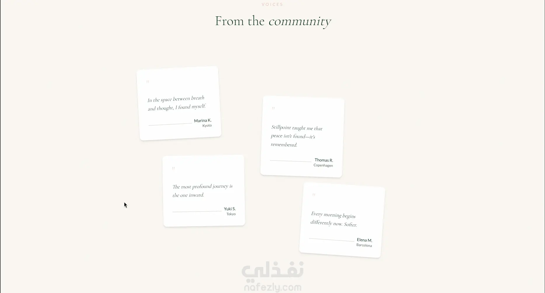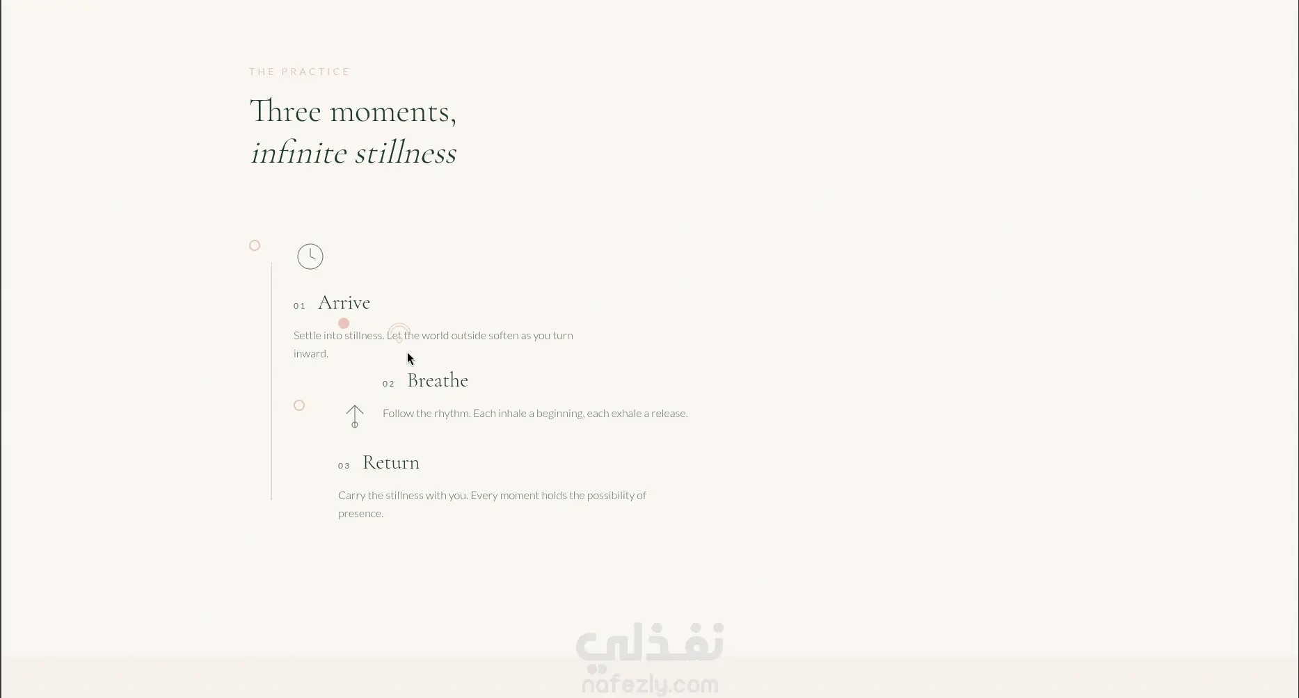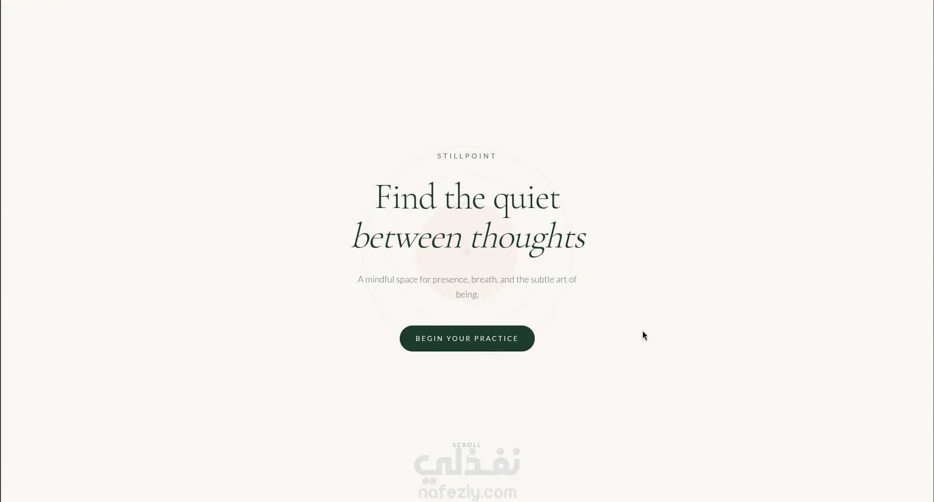 صفحة تسويقية كاملة لتطبيق تأمل ومايندفولنس، بتصميم افتتاحي هادئ يجمع بين الأناقة اليابانية وأسلوب المجلات الراقية. تشمل: سيكشن هيرو مع دائرة تنفس متحركة، شرح خطوات الاستخدام، بطاقات المميزات، تقييمات العملاء، وفوتر بنموذج اشتراك — مع انيميشن ناعم عند التمرير. مناسب لأي تطبيق صحة أو لايف ستايل.