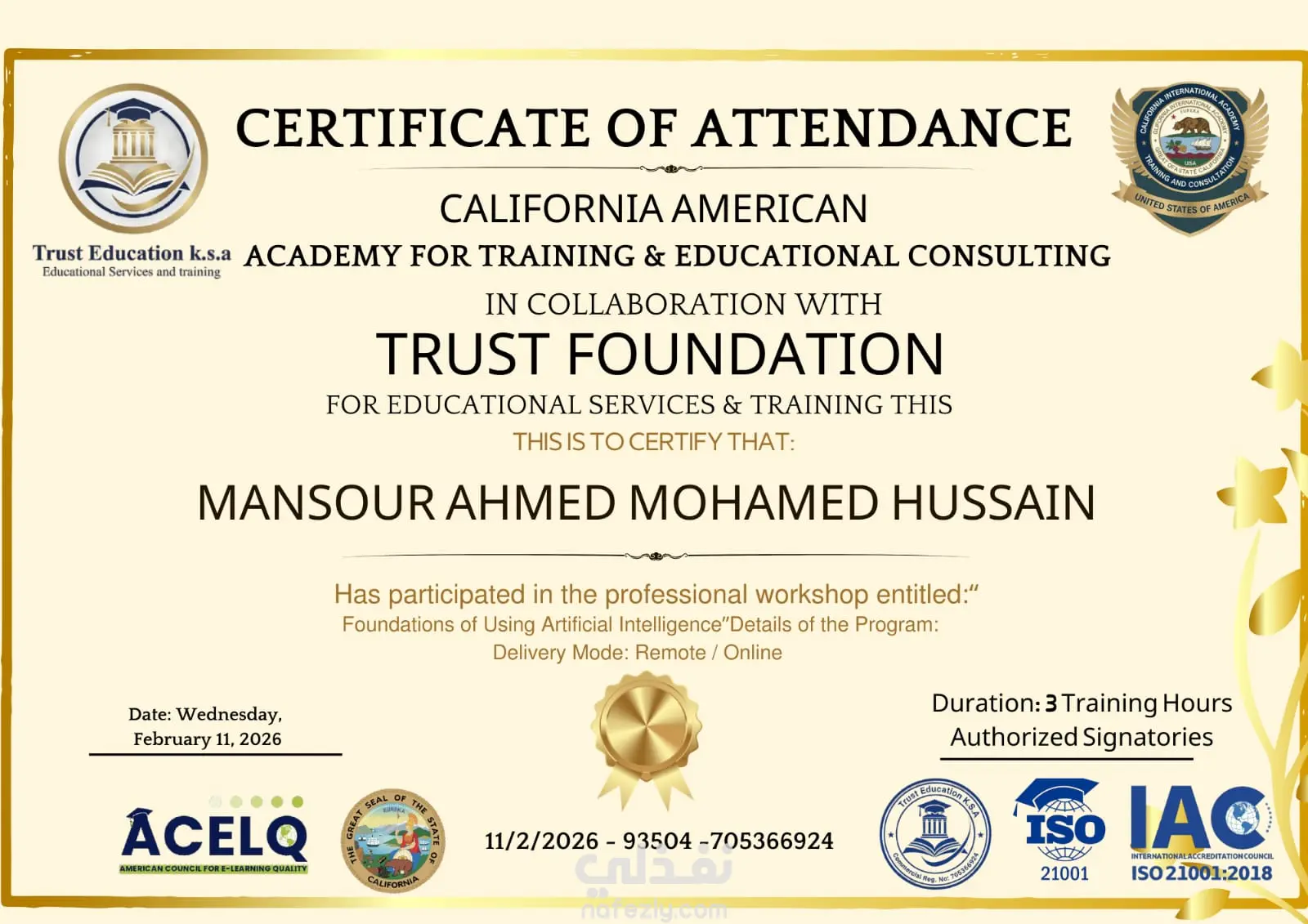 تصميم شهادة تقدير احترافية وأنيقة أقدم خدمة تصميم شهادات تقدير مميزة ومناسبة للمدارس، الدورات التدريبية، الشركات والفعاليات. سيتم تصميم شهادة بتنسيق جذاب مع إمكانية إضافة الاسم، الشعار، التاريخ والتوقيع. التسليم بجودة عالية وجاهزة للطباعة أو الاستخدام الإلكتروني (PNG / PDF). مقابل السعر المعروض في الخدمة يتم تصميم شهادة تقدير واحدة فقط.