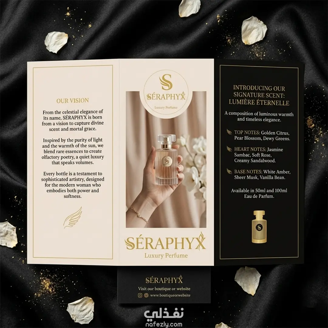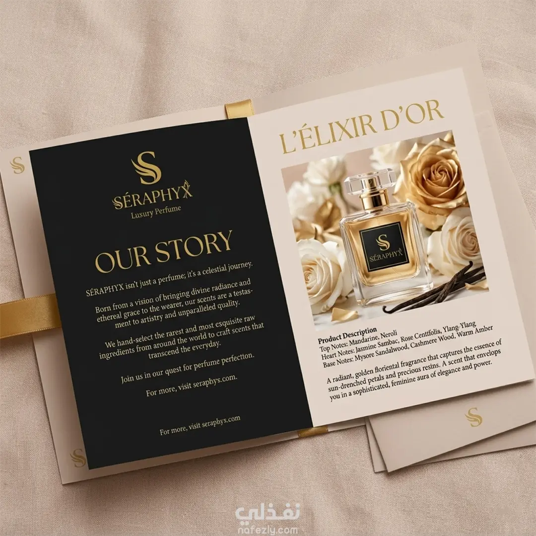 هذا المشروع يعكس أسلوب تصميم احترافي موجه للبراندات الراقية في مجال العطور والمنتجات الفاخرة.