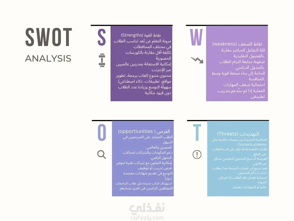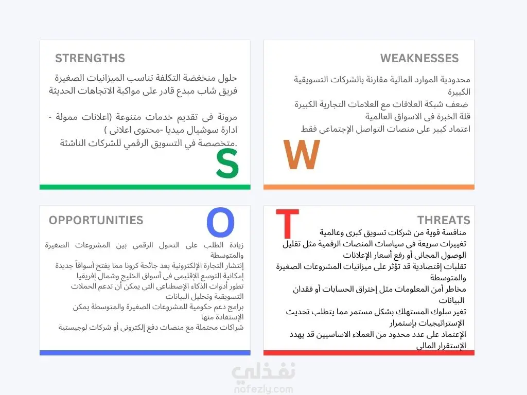تحليل SWOT Analysis هو أداة مهمة جدًا لفهم وضع أي مشروع أو بيزنس بشكل واضح، وبيساعدك تاخدي قرارات صح بناءً على نقاط القوة والضعف والفرص والتهديدات. كلمة SWOT اختصار لـ: S = Strengths (نقاط القوة) W = Weaknesses (نقاط الضعف) O = Opportunities (الفرص) T = Threats (التهديدات)