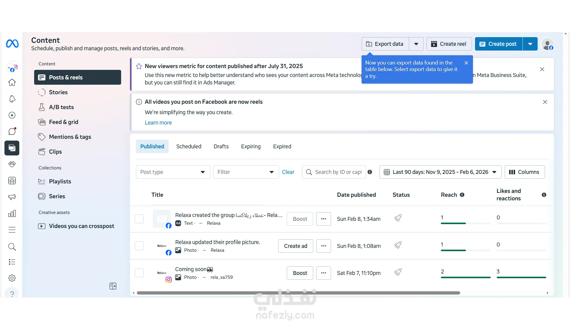 "في هذا المشروع، قمت بتولي مسؤولية إدارة المحتوى لصفحة [Relaxa] عبر منصات Meta (فيسبوك وإنستجرام). ركزت على تنظيم التواجد الرقمي وضمان استمرارية النشر لزيادة تفاعل الجمهور. المهام التي قمت بتنفيذها: إدارة وجدولة المنشورات: استخدام أدوات Meta Business Suite لجدولة المنشورات (Posts) والريلز (Reels) في الأوقات التي يتواجد فيها الجمهور بكثافة. متابعة الأداء: مراقبة الإحصائيات (Reach & Engagement) لكل منشور لتحليل نوع المحتوى الذي يفضله المتابعون. تنظيم التواجد الرقمي: تنسيق المحتوى بين فيسبوك وإنستجرام لضمان وحدة الهوية البصرية والرسالة التسويقية. تحسين الظهور: متابعة تحديثات المنصة وتطبيق أفضل الممارسات لزيادة الوصول الطبيعي (Organic Reach).