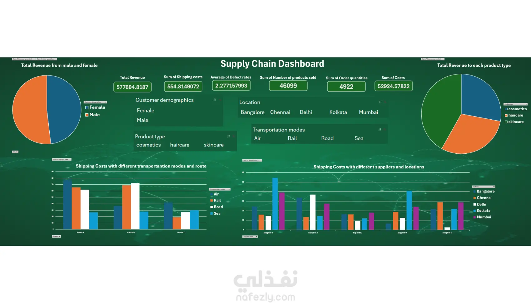 1. نوع العمل:تحليل بيانات متقدم (Data Analysis) وإعداد تقارير تفاعلية ولوحات تحكم (Dashboards) لمراقبة أداء سلاسل الإمداد، مع استخراج رؤى تجارية (Business Insights) تساهم في اتخاذ قرارات دقيقة. 2. مميزات العمل:تحليل شامل للربحية: حساب إجمالي الإيرادات ($577,604$) ومقارنتها بتكاليف التصنيع والشحن. تقييم جودة الموردين: تتبع معدلات العيوب (Defect Rates) لكل فئة منتج (مستحضرات تجميل، عناية بالشعر، عناية بالبشرة) وتحديد الموردين الأكثر كفاءة. تحليل اللوجستيات: دراسة أداء شركات الشحن (Carriers) وتكاليف المسارات (Routes) وطرق النقل المختلفة (جوي، بري، سكك حديدية). مراقبة المخزون والإنتاج: تحليل أحجام الإنتاج حسب الموقع (مثل Mumbai, Kolkata, Delhi) وربطها بطلبات العملاء.الدقة العالية: استخدام الجداول المحورية (Pivot Tables) المتقدمة لضمان تحديث البيانات ومرونتها. 3. طريقة التنفيذ: تم تنفيذ المشروع وفقاً للخطوات الاحترافية التالية: تنظيف البيانات (Data Cleaning): فحص البيانات الخام والتأكد من عدم وجود قيم مفقودة أو غير متناسقة في ملف الـ CSV. هيكلة البيانات: تنظيم البيانات في جداول مرتبطة لسهولة الاستعلام. المعالجة باستخدام الجداول المحورية (Pivot Tables): تصنيف الإيرادات حسب نوع المنتج (Product type). حساب متوسط معدلات العيوب لكل فئة. تحليل الإنتاج حسب المنطقة الجغرافية (Location). تصور البيانات (Data Visualization): بناء لوحة تحكم تفاعلية (Dashboard) تعتمد على المخططات البيانية (Charts) التي توضح العلاقات المعقدة بين تكاليف الشحن والنمو المالي. الاستنتاجات: تلخيص النتائج في تقرير نهائي يوضح مكامن القوة والضعف في سلسلة التوريد.