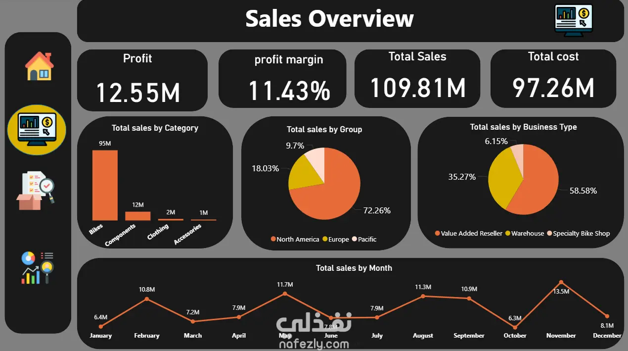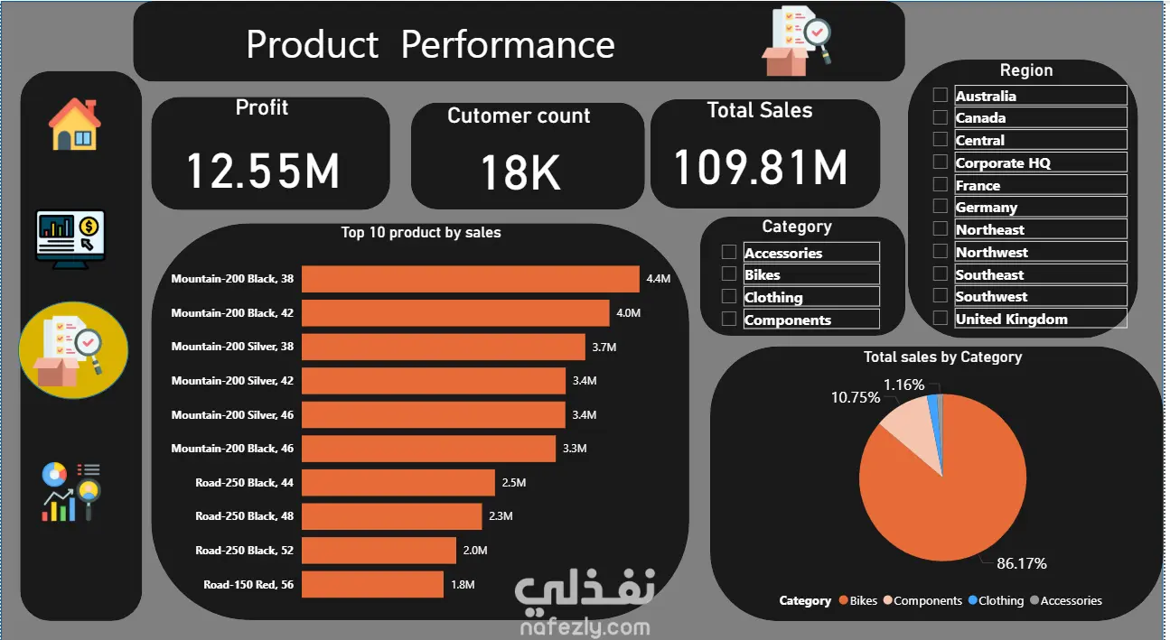 تنظيف البيانات وتحويلها (باور كويري) إزالة البيانات المكررة ومعالجة القيم المفقودة توحيد أسماء الأعمدة وأنواع البيانات إعداد جداول الحقائق والأبعاد نمذجة البيانات إنشاء علاقات بين المبيعات والمنتجات والعملاء والمناطق تطبيق نموذج نجمة نظيف لتحسين الأداء حسابات DAX إجمالي المبيعات إجمالي الربح هامش الربح الكمية المباعة المقاييس الزمنية (منذ بداية العام / الاتجاهات) تصميم التصورات ولوحات المعلومات تصميم صفحات تقارير تفاعلية إضافة أدوات تصفية للتصفية الديناميكية التركيز على الوضوح وسرد قصص الأعمال ? مؤشرات الأداء الرئيسية والرؤى مؤشرات الأداء الرئيسية إجمالي إيرادات المبيعات إجمالي الربح الكمية المباعة هامش الربح الرؤى تحديد فئات الدراجات الأفضل أداءً والتي تساهم بأعلى الإيرادات تسليط الضوء على اختلافات المبيعات الإقليمية بين البلدان تحليل شرائح العملاء التي تقود غالبية المبيعات تتبع اتجاهات المبيعات بمرور الوقت لرصد النمو وفترات التراجع