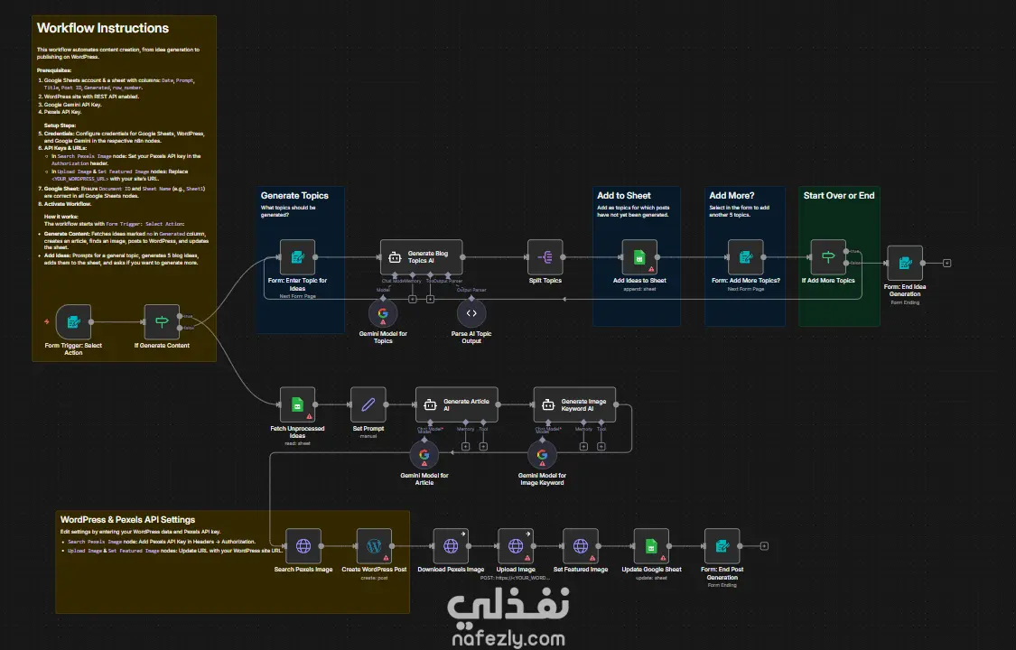 فكرة النظام المشروع عبارة عن Workflow ذكي يعمل كالتالي: إدخال فكرة أو Topic من خلال Form. الذكاء الاصطناعي يولد عدة عناوين متعلقة بالفكرة. يتم تقسيم العناوين وتخزينها في Google Sheets. لكل عنوان: يتم توليد مقال كامل متوافق مع SEO. استخراج كلمة مفتاحية رئيسية. البحث عن صورة مناسبة عبر API. إنشاء المقال على WordPress. رفع الصورة كـ Featured Image. تحديث حالة النشر في Google Sheets. كل ده بيتم بشكل أوتوماتيكي بدون تدخل يدوي
