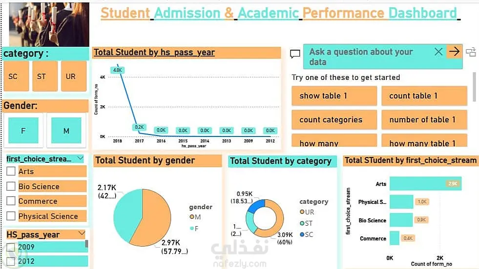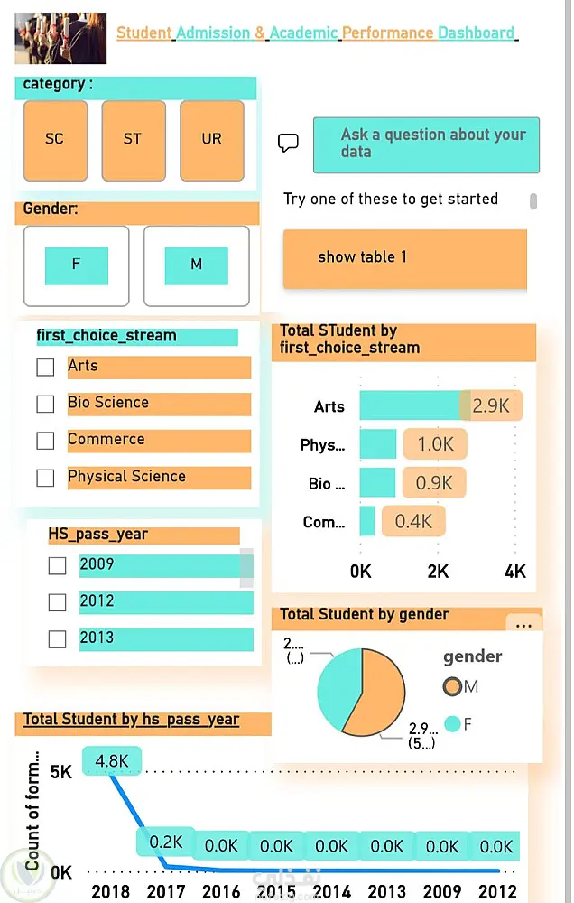 في هذا المشروع قمت بتحليل بيانات طلاب إحدى المدارس بهدف استخراج مؤشرات تساعد الإدارة على تحسين الأداء الأكاديمي ومتابعة مستوى الطلاب بشكل أكثر دقة. استخدمت Power BI لمعالجة البيانات وبناء لوحات معلومات تفاعلية تعرض: توزيع الطلاب حسب الصفوف والمراحل الدراسية تحليل الدرجات ومتوسط التحصيل الدراسي تحديد الطلاب المتفوقين والطلاب الذين يحتاجون دعم إضافي نسب الحضور والغياب مقارنة الأداء بين الفصول أو المواد المختلفة قمت بتنظيف البيانات وتنظيمها وبناء نموذج بيانات يتيح استخراج مؤشرات دقيقة تساعد متخذي القرار. كما صممت Dashboard تفاعلي متوافق مع الموبايل لتسهيل متابعة النتائج من قبل الإدارة في أي وقت. 🎯 هدف المشروع: تقديم رؤية تحليلية واضحة تدعم تحسين جودة التعليم، وتساعد في اتخاذ قرارات مبنية على بيانات دقيقة حول أداء الطلاب.