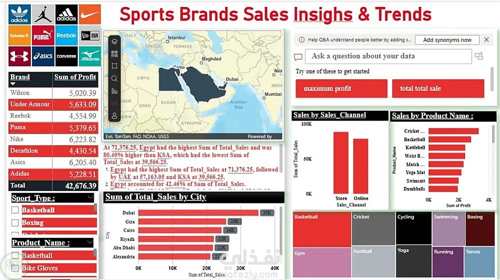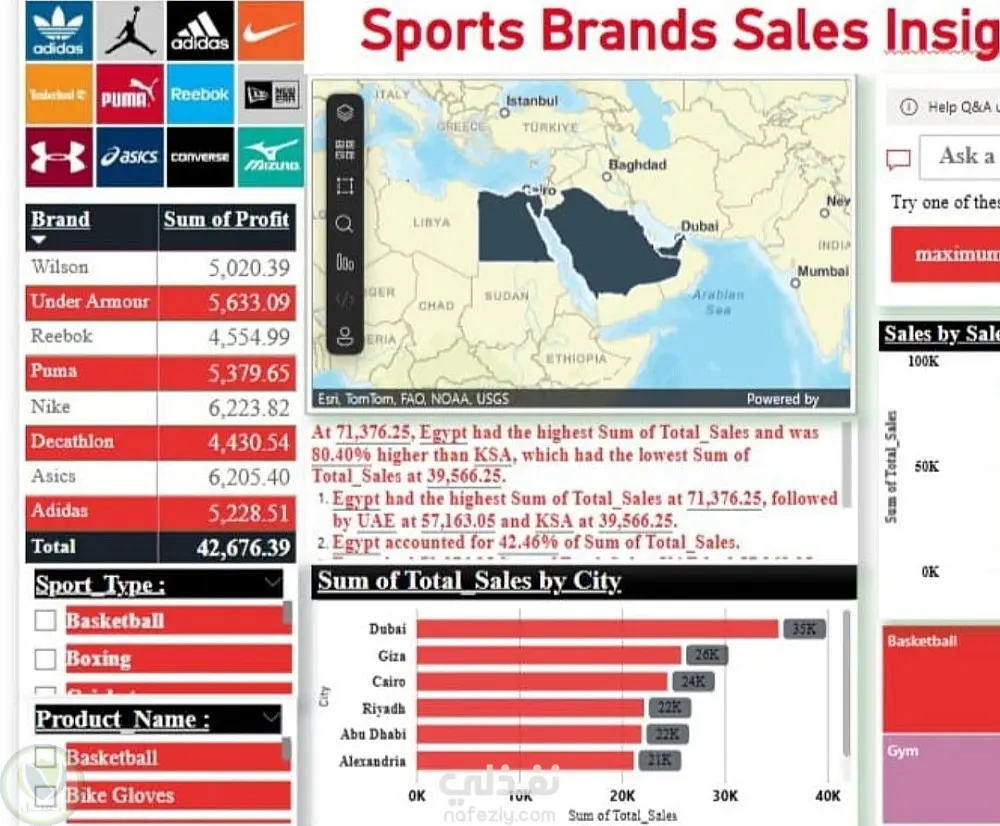 كما تم تصميم لوحة معلومات تفاعلية تسهّل تصفية البيانات وتحليلها حسب البراند أو نوع الرياضة أو الفترة الزمنية.