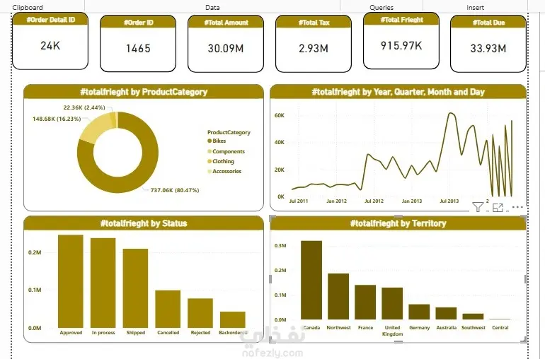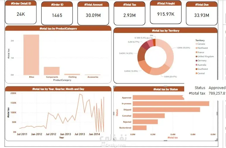 قمت بتصميم وتطوير لوحة تحكم (Dashboard) متكاملة تهدف إلى تحليل بيانات المبيعات وتتبع حالة الطلبات بشكل دقيق ولحظي. اللوحة مصممة لتقديم رؤية شاملة لأداء المبيعات وتسهيل عملية اتخاذ القرار
