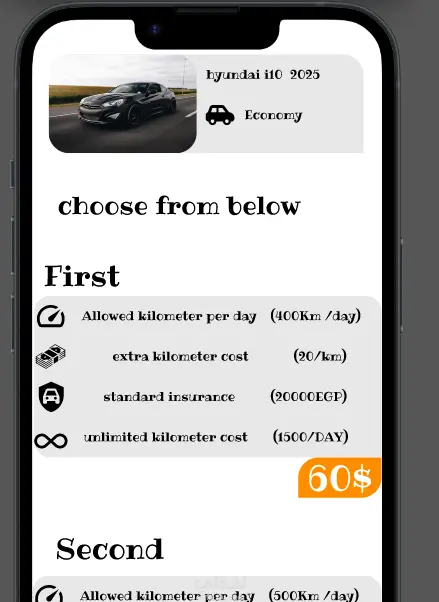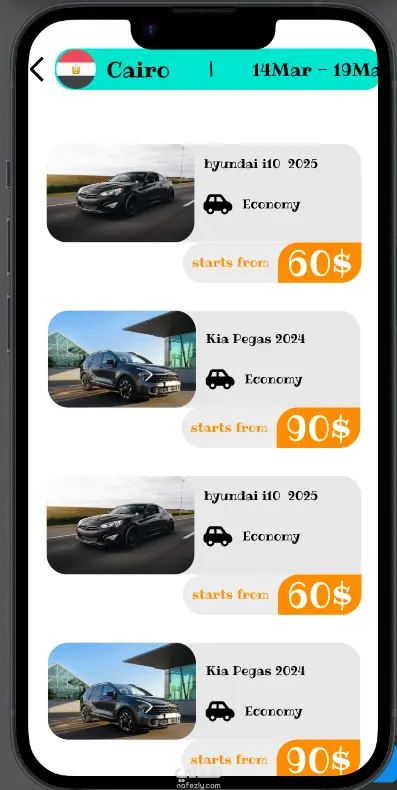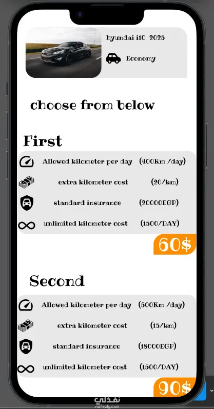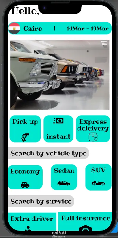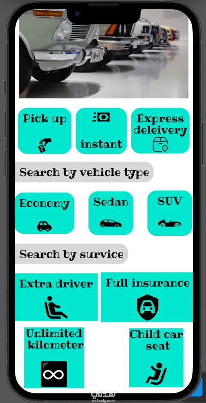 كما يوفر التطبيق إمكانية البحث حسب نوع السيارة (Economy – Sedan – SUV) لتسهيل اتخاذ القرار، بالإضافة إلى عرض خدمات إضافية مثل: