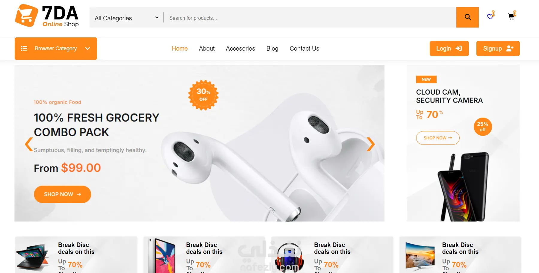 "واجهة متجر إلكتروني حديثة لعرض وبيع المنتجات عبر الإنترنت، تتضمن نظام تصفح للفئات، قسم العروض الخاصة (Hot Deals)، وإمكانية إضافة المنتجات إلى سلة التسوق مع عرض تفاصيل الطلب. يركز التصميم على تجربة مستخدم سهلة وتنظيم واضح للمنتجات مع إبراز الخصومات والعروض بطريقة جذابة."