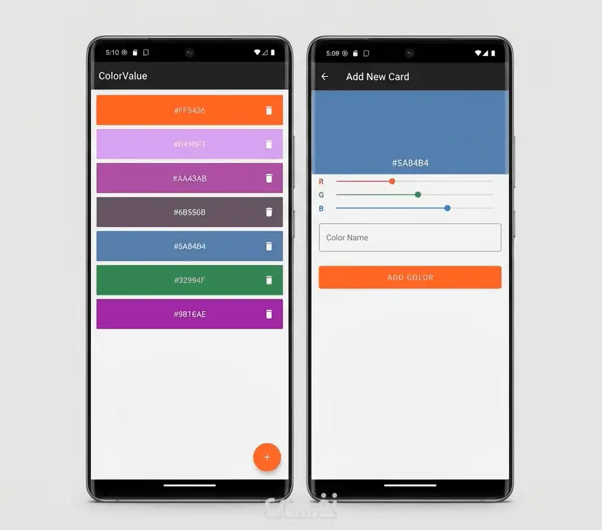 تطبيق Android بسيط وعملي لإدارة الألوان (Color Manager)، يتيح للمستخدم إنشاء وحفظ الألوان المفضلة بطريقة سهلة ومنظمة.
