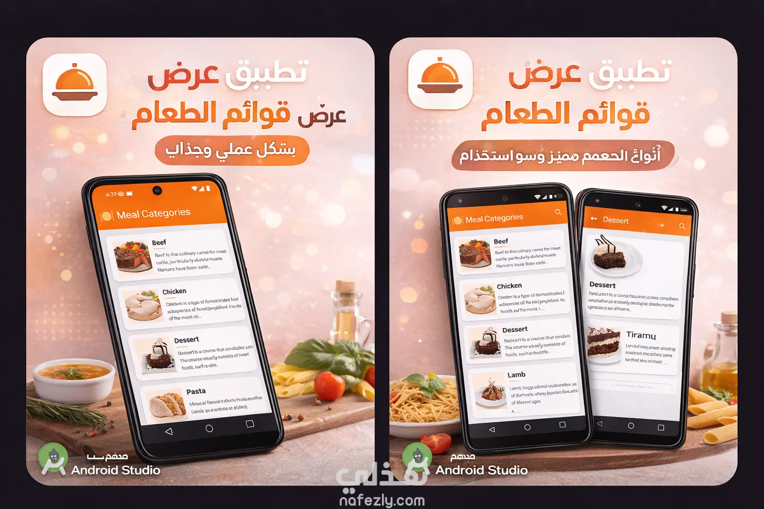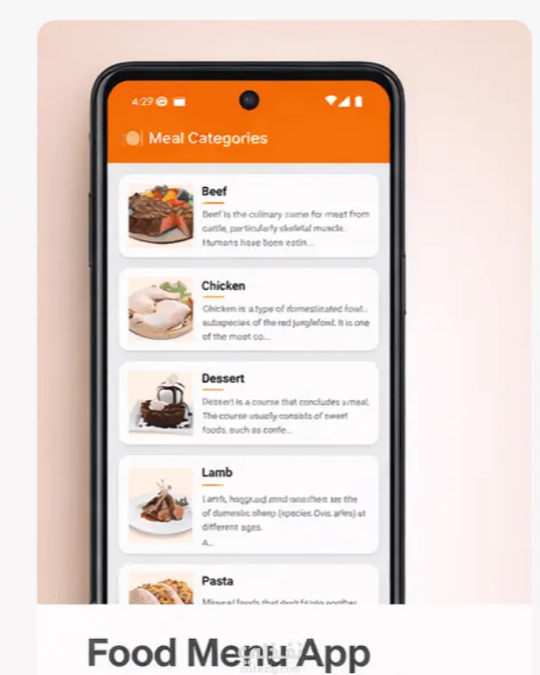 تطبيق Android لعرض قوائم الطعام (Food Menu) بطريقة منظمة وجذابة، يهدف إلى تحسين تجربة المستخدم في تصفح أنواع الأطعمة المختلفة بسهولة. يتيح التطبيق للمستخدم: تصفح تصنيفات الطعام (لحوم – دجاج – حلويات – وغيرها) عرض صور لكل صنف بشكل جذاب قراءة وصف مختصر لكل نوع من الأطعمة واجهة سهلة وسريعة في التنقل يتميز التطبيق بتصميم UI عصري يعتمد على: Cards منظمة لعرض المحتوى ألوان مريحة (Orange Theme) تعكس طابع الطعام استخدام الصور لتحسين تجربة المستخدم التقنيات المستخدمة: Android (Java / Kotlin) RecyclerView لعرض القوائم Material Design تصميم UI/UX بسيط واحترافي الهدف من التطبيق هو تقديم تجربة سهلة وجذابة لعرض قوائم الطعام، مناسبة لتطبيقات المطاعم أو خدمات الدليفري.