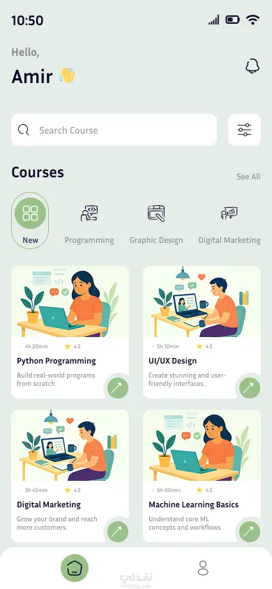 هذا المشروع هو تصميم واجهة مستخدم حديث لتطبيق الجوال لمنصة تعلم عبر الإنترنت. كان الهدف هو خلق تجربة بسيطة وجذابة وسهلة الاستخدام تساعد المستخدمين على اكتشاف الدورات بسهولة وبدء تعلم مهارات جديدة. يشمل التصميم شاشات الانضمام وتسجيل الدخول، وواجهة منزلية نظيفة حيث يمكن للمستخدمين استكشاف فئات مختلفة من الدورات. يركز التصميم على الوضوح وسهولة التنقل لضمان رحلة تعلم سلسة. تم استخدام لوحة ألوان ناعمة ورسومات ودية لخلق بيئة مريحة ومحفزة للمستخدمين.