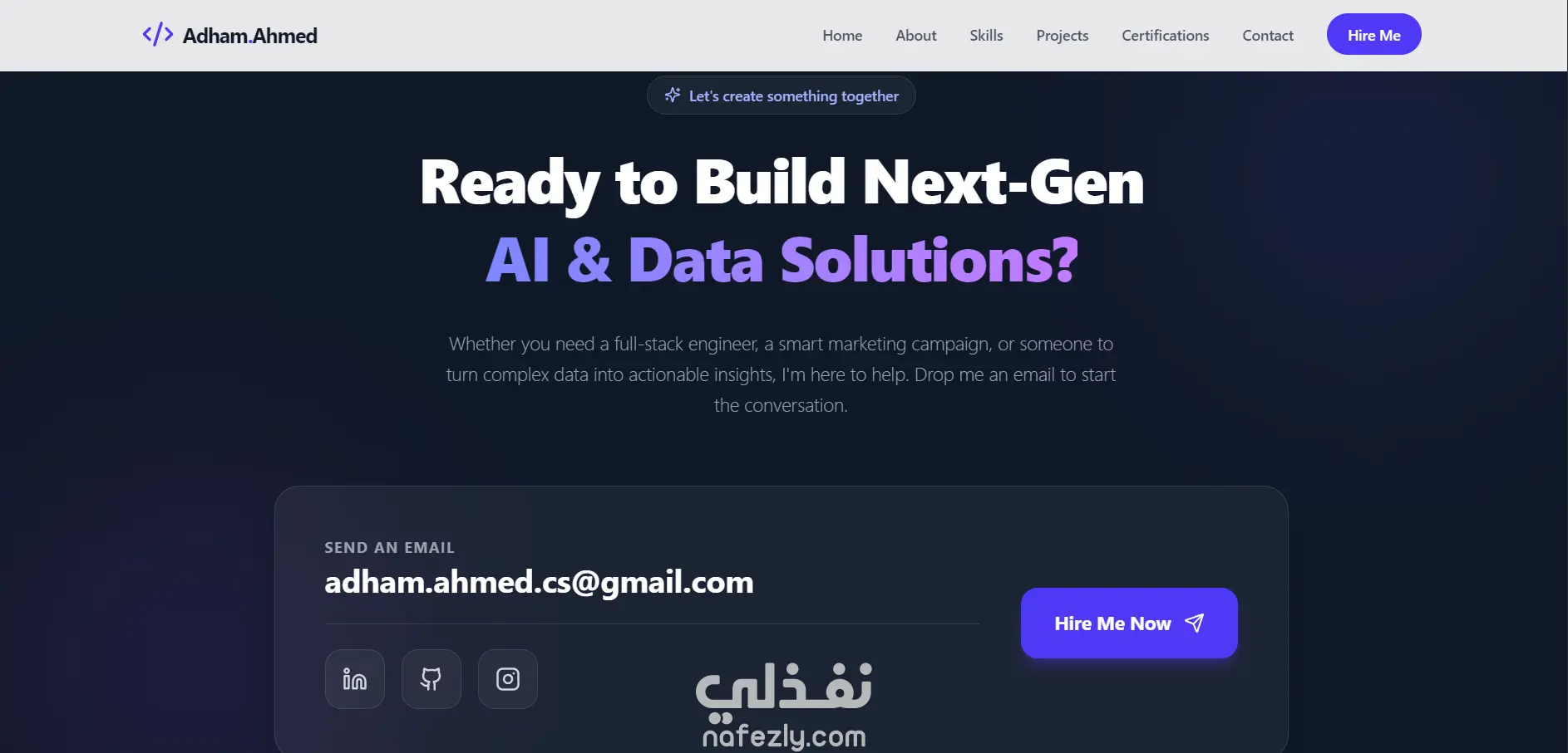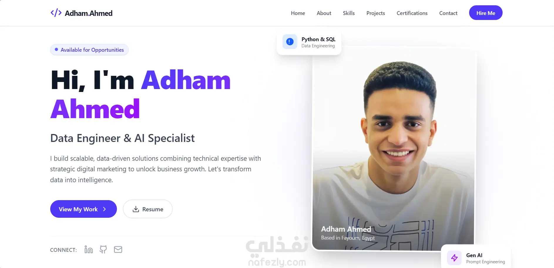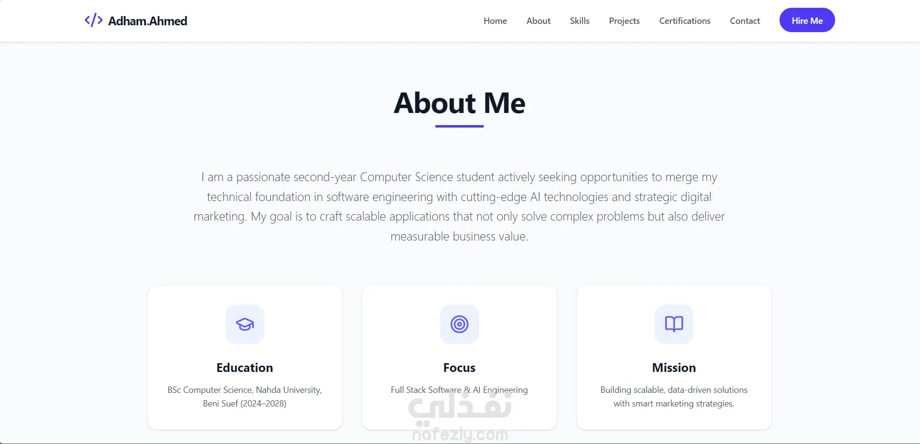 الموقع يتميز بواجهة مستخدم عصرية متجاوبة مع جميع الأجهزة (موبايل – كمبيوتر – تابلت)، ويحتوي على أقسام رئيسية مثل: عنّي، المهارات، المشاريع، الشهادات، التواصل.