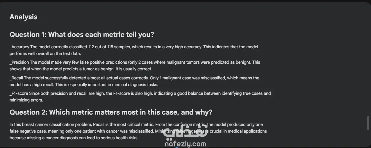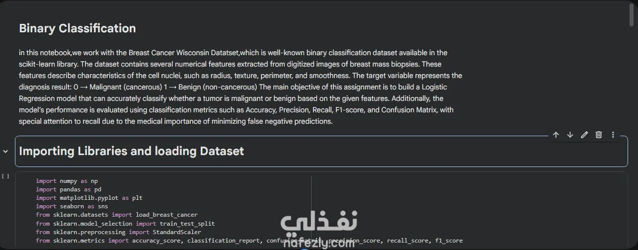 قمت بتطوير نموذج ذكي لتصنيف أورام سرطان الثدي إلى أورام حميدة (Benign) أو خبيثة (Malignant)، باستخدام بيانات طبية حقيقية وتحليلها من خلال تقنيات التعلم الآلي. المشروع يعتمد على Dataset مشهورة من مكتبة Scikit-learn، ويستخدم خصائص طبية مستخرجة من صور الخلايا مثل الحجم، الشكل، والملمس لتحديد نوع الورم بدقة.