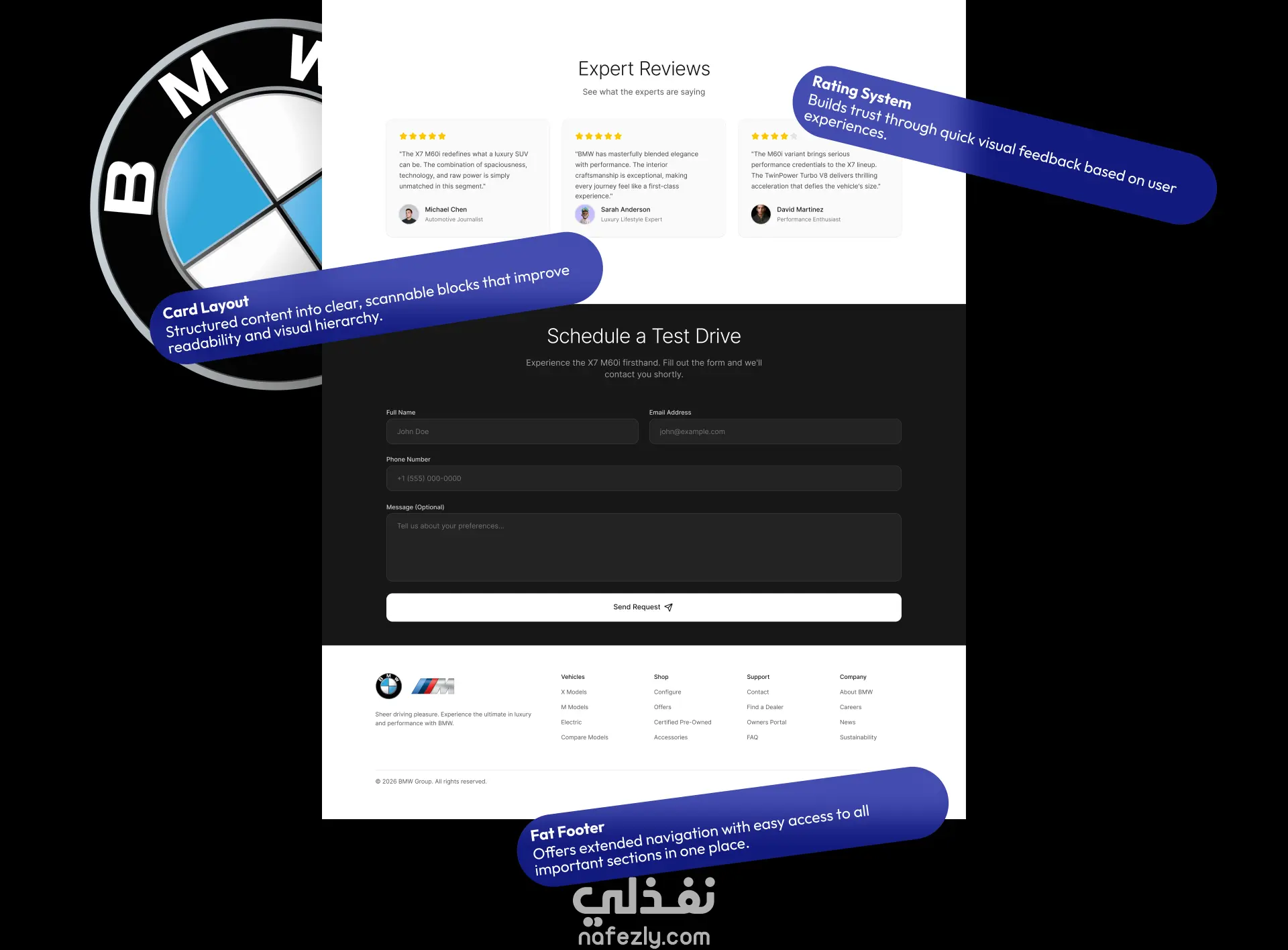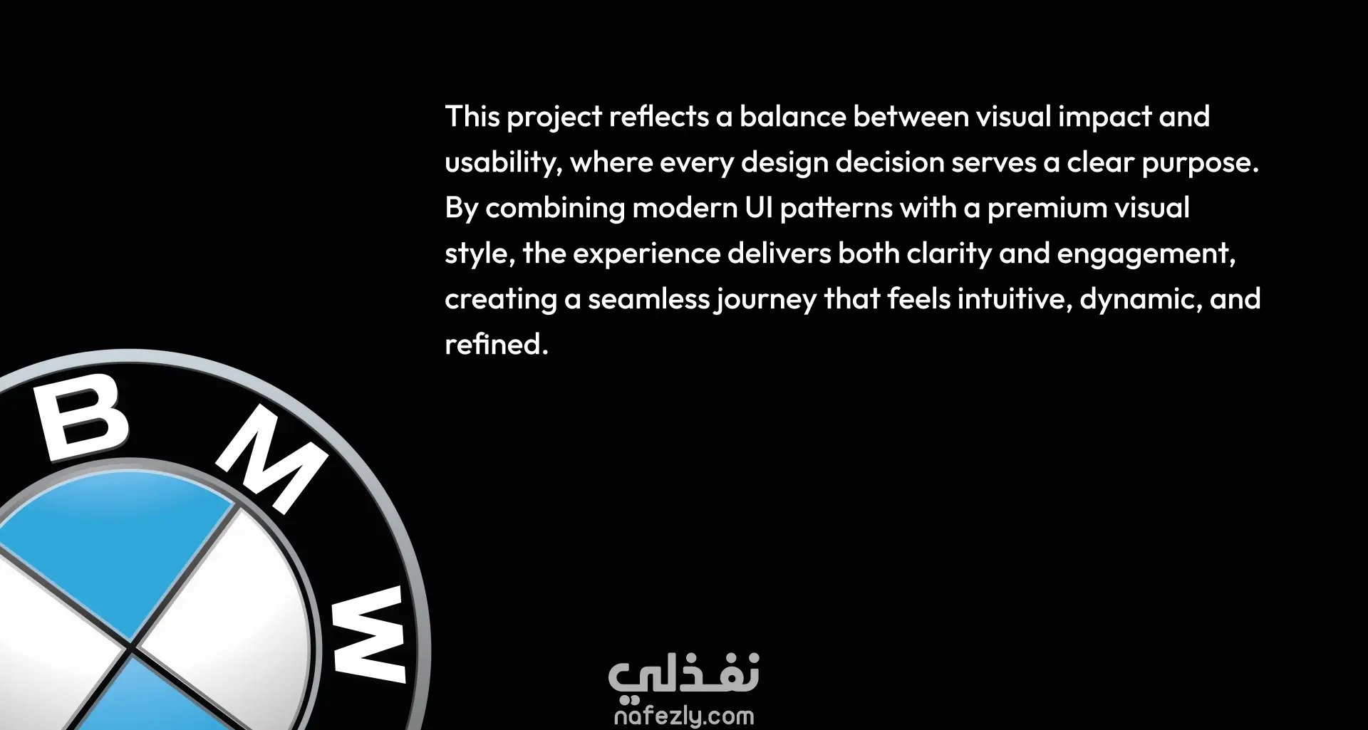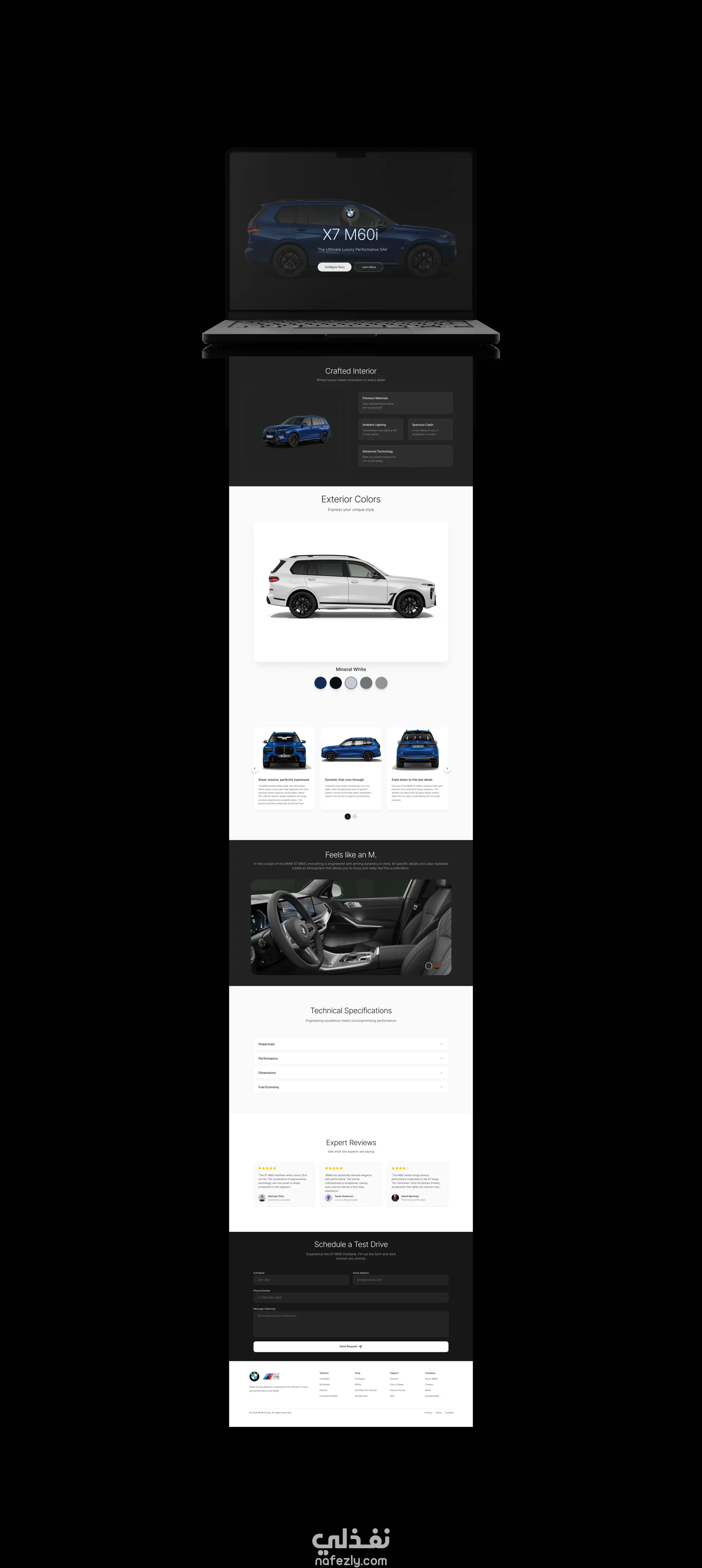 صفحة هبوط مميزة لقطاع السيارات، مستوحاة من هوية BMW، مصممة لتقديم تجربة مستخدم راقية وعالية الأداء. يركز المشروع على الجمع بين سرد بصري قوي وسهولة استخدام واضحة من خلال أنماط واجهة المستخدم الرئيسية مثل البطاقات، والعرض الدائري، والترقيم، والقوائم المنسدلة، وأنظمة التقييم، والبحث الذكي. بفضل تصميمها ذي الطابع الداكن ولمسات اللون الأزرق النيون، تُبرز هذه التجربة الفخامة والوضوح وسلاسة التفاعل طوال رحلة المستخدم.