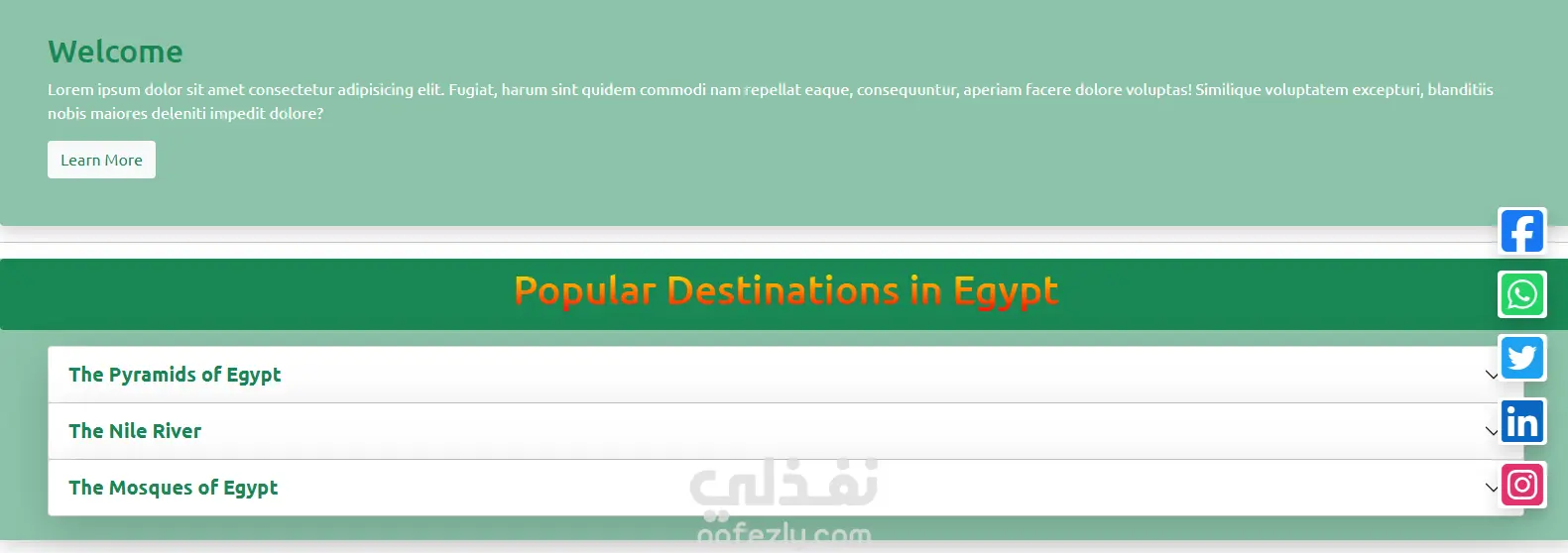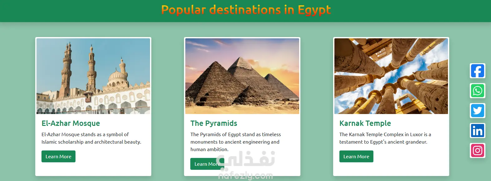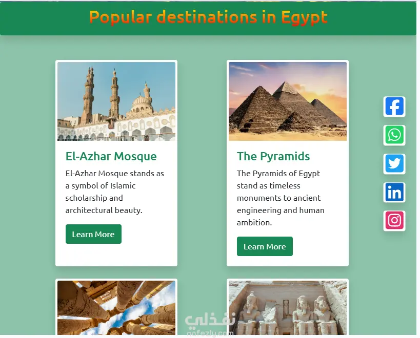 قمت بإنشاء موقع تعريفي عن أهم المعالم السياحية في مصر باستخدام Bootstrap، مع تصميم متجاوب يضمن تجربة مميزة على مختلف الأجهزة.