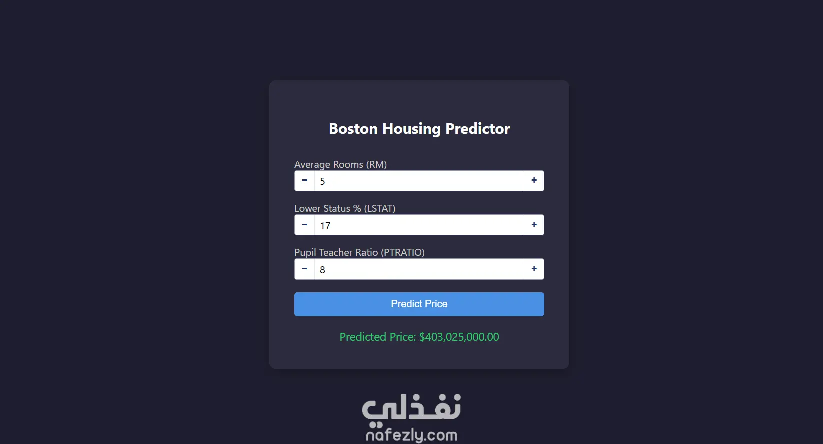 مشروع متكامل من البداية إلى النهاية يعتمد على نموذج تعلم آلي مدرَّب على مجموعة بيانات "اسعار المنازل في بوسطن" لتوقع أسعار المنازل. يأخذ النموذج ثلاثة مدخلات عدد الغرف، ونسبة السكان الأقل دخلاً، ونسبة الطلاب إلى المعلمين ثم يعرض السعر المتوقع فورًا عبر واجهة ويب تفاعلية مبنية باستخدام الداش. يشمل المشروع مرحلة التحليل الاستكشافي للبيانات، وتدريب النموذج، ثم نشره كتطبيق ويب