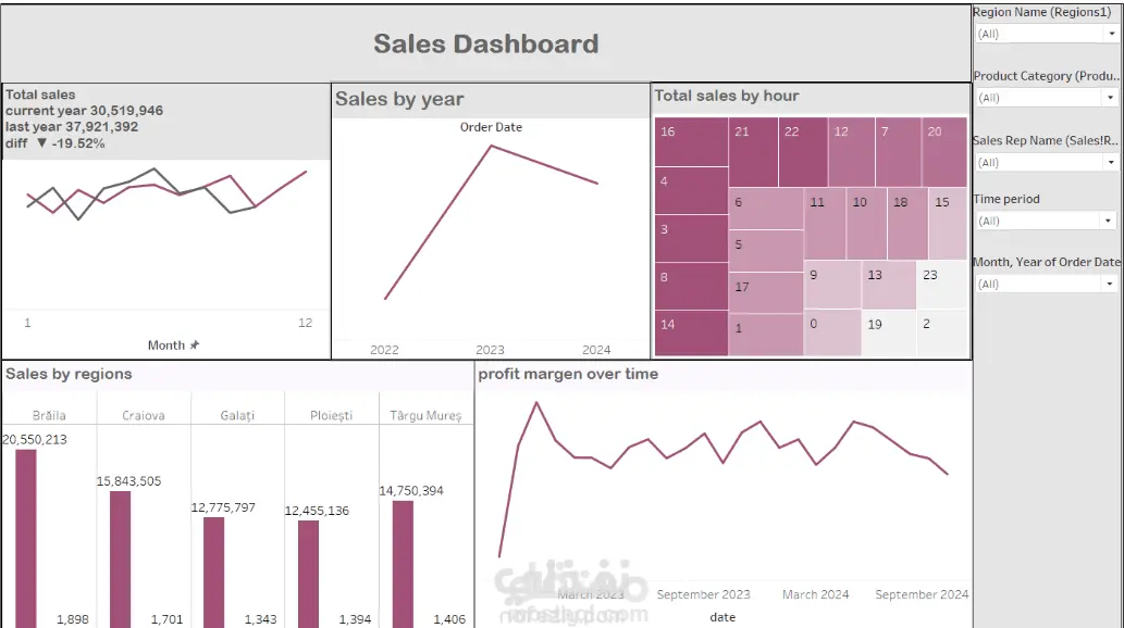 مشروع Dashboard تفاعلي لتحليل مبيعات Smart Mart، يهدف إلى تقديم رؤية شاملة لأداء الأعمال ودعم اتخاذ القرار. يشمل المشروع: مؤشرات الأداء الرئيسية (KPIs): إجمالي المبيعات، إجمالي الكمية المباعة، إجمالي الأرباح، متوسط حجم الطلب، معدل نمو المبيعات، ومعدل الإرجاع. تحليل المبيعات حسب الفئة والمنتج: تحديد المنتجات الأعلى مبيعًا والفئات الأكثر ربحية. تحليل المبيعات حسب الوقت: توزيع المبيعات على ساعات اليوم والأيام، لمراقبة أنماط الشراء. تحليل المبيعات حسب المناطق الجغرافية: مقارنة أداء المناطق المختلفة لتحديد الفرص والتحديات. أداء مندوبي المبيعات: تتبع أداء كل مندوب وقياس المساهمة في إجمالي المبيعات. تتبع هامش الربح بمرور الوقت: فهم الربحية ومعدل النمو لتحديد التحسينات الاستراتيجية. تم تصميم Dashboard بطريقة تفاعلية وسهلة الاستخدام، مع إمكانية تصفية البيانات حسب الفئة، المنطقة، الوقت، أو المندوب، مما يتيح استكشاف البيانات واستخلاص رؤى دقيقة بسرعة. الأدوات المستخدمة: Tableau
